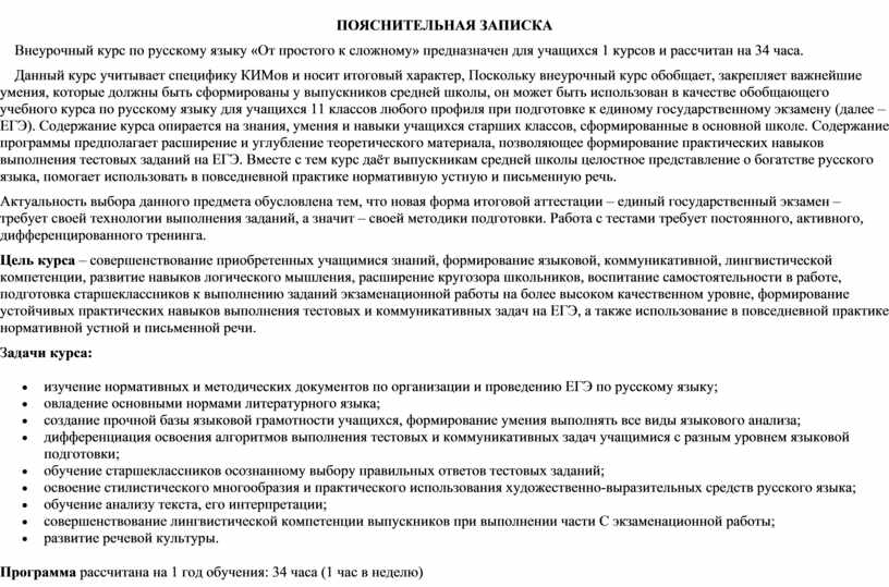 Внеурочный курс по русскому языку «От простого к сложному» предназначен для учащихся 1 курсов и рассчитан на 34 часа.