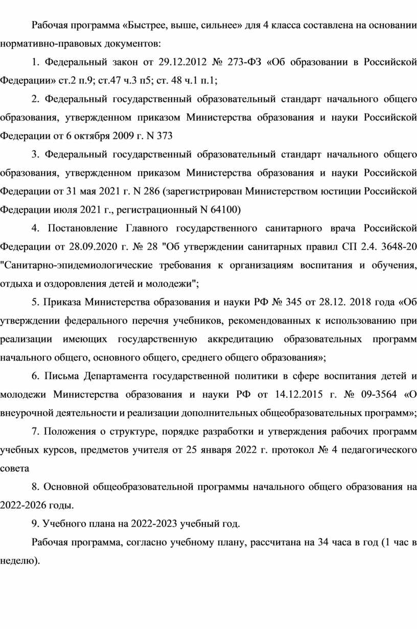 Рабочая программа «Быстрее, выше, сильнее» для 4 класса составлена на основании нормативно-правовых документов: