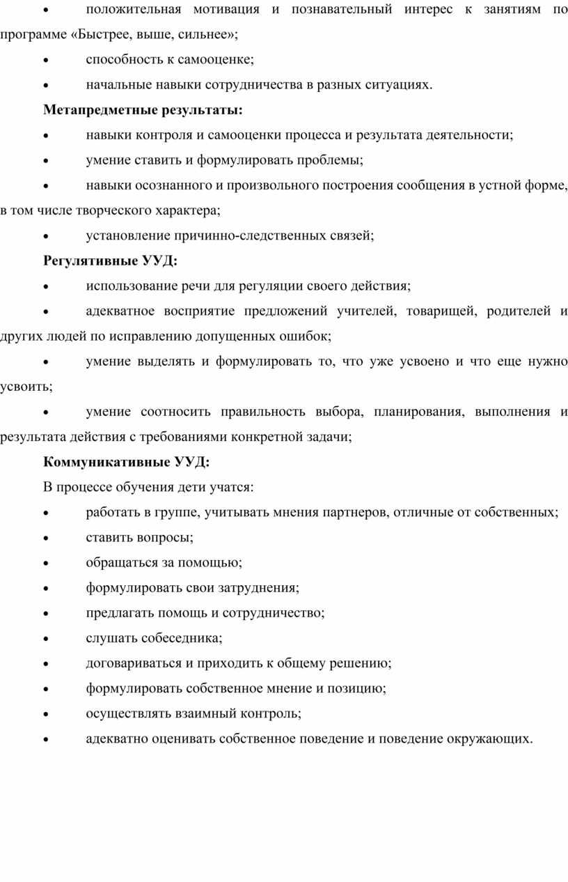 · положительная мотивация и познавательный интерес к занятиям по программе «Быстрее, выше, сильнее»;