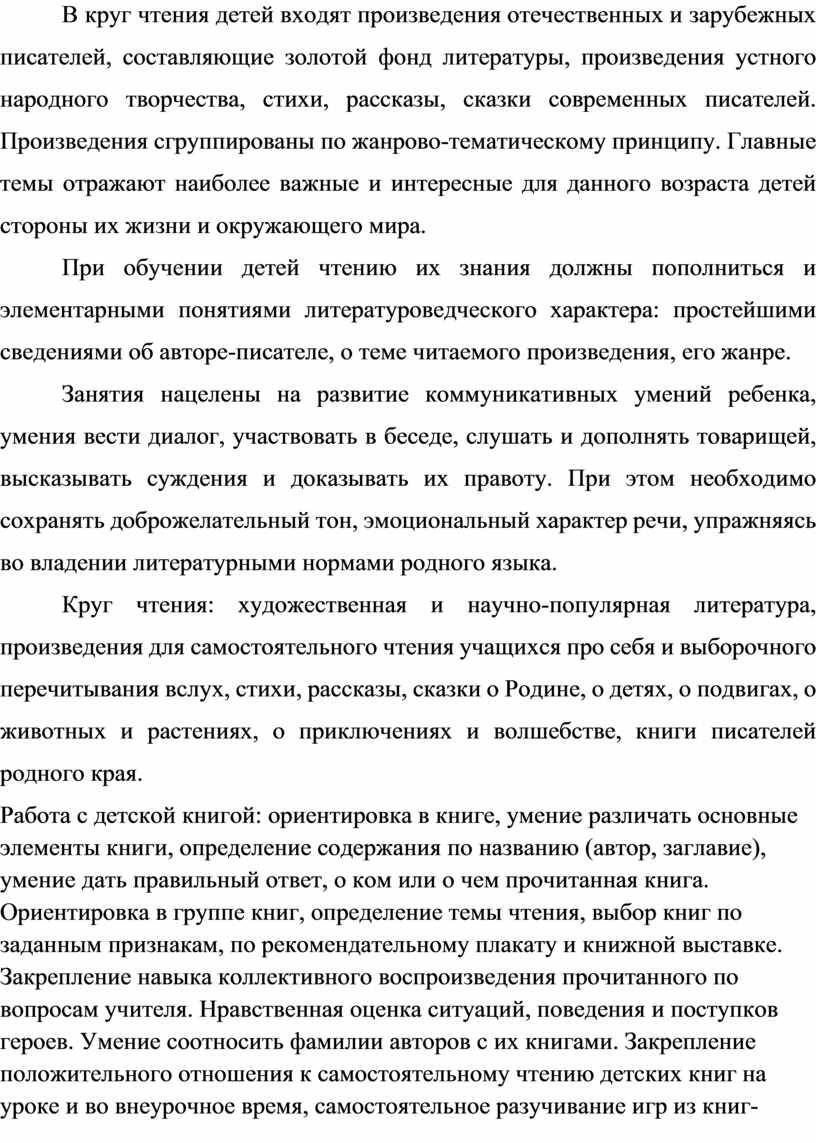 Круг чтения: художественная и научно-популярная литература, произведения для самостоятельного чтения учащихся про себя и выборочного перечитывания вслух, стихи, рассказы, сказки о Родине, о детях, о подвигах, о животных и растениях, о приключениях и волшебстве, книги писателей родного края.
