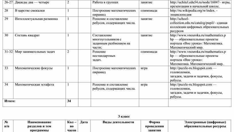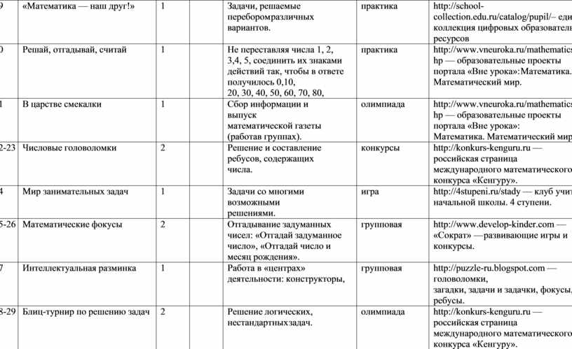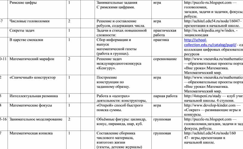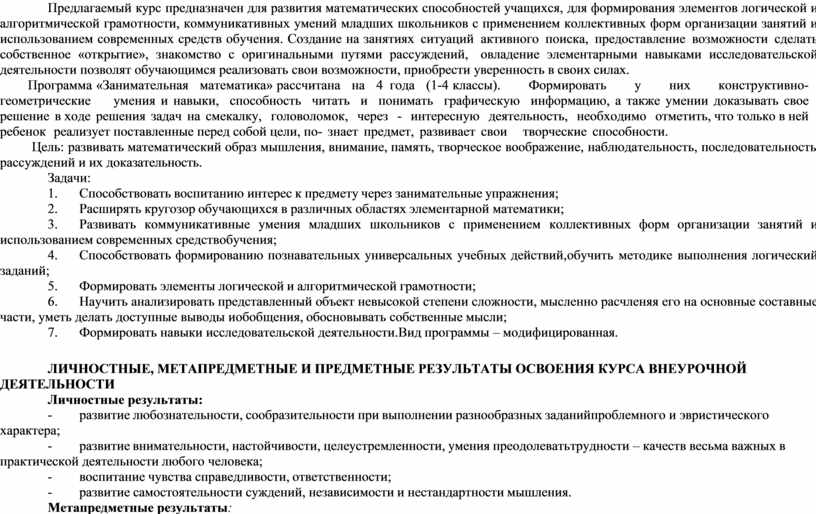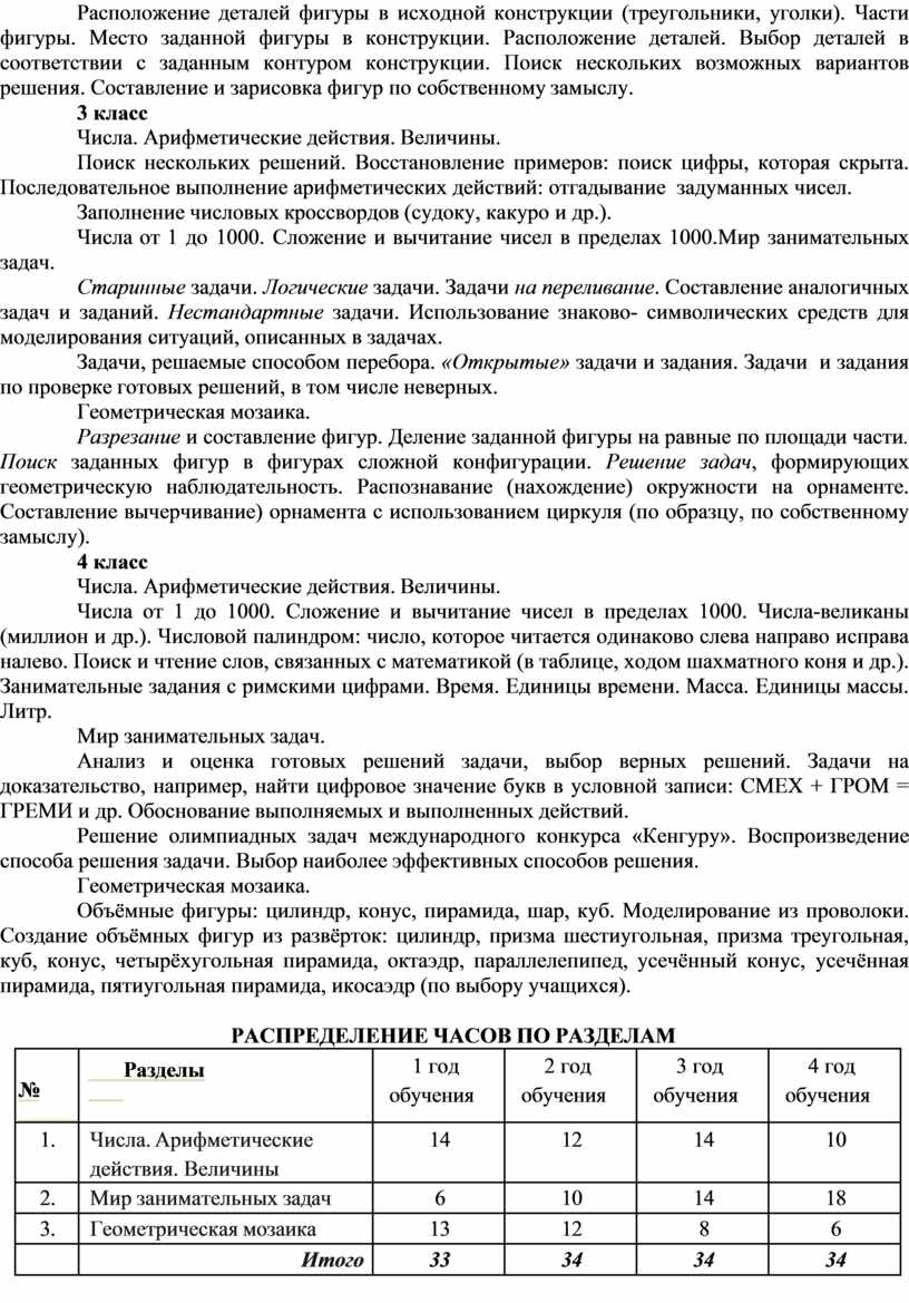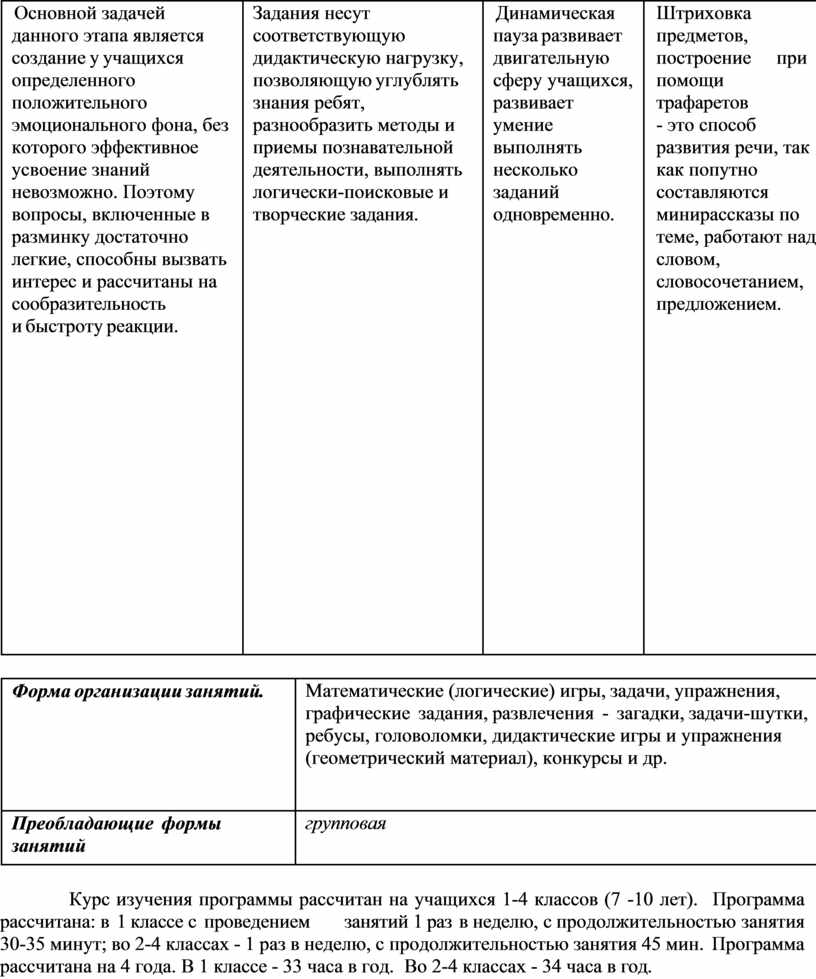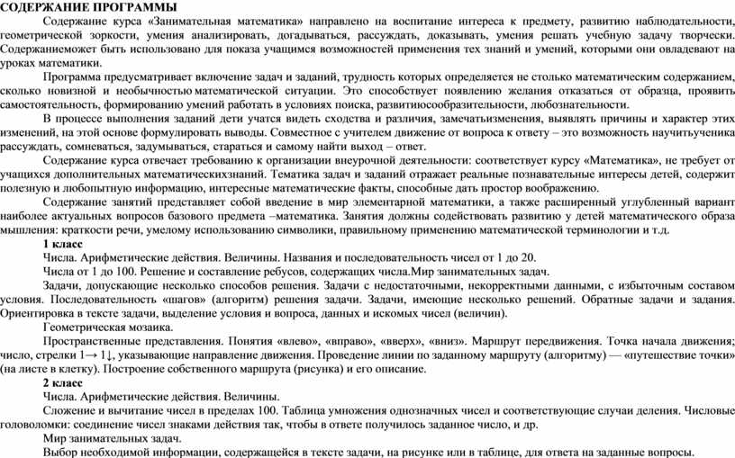 Программа «Занимательная математика» рассчитана на 4 года (1-4 классы). Формировать у них конструктивно-геометрические умения и навыки, способность читать и понимать графическую информацию, а также умении доказывать свое решение в ходе решения задач на смекалку, головоломок, через - интересную деятельность, необходимо отметить, что только в ней ребенок реализует поставленные перед собой цели, по- знает предмет, развивает свои творческие способности.