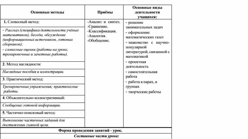 - Рассказ (специфика деятельности учёных математиков), беседа, обсуждение (информационных источников, готовых сборников); - словесные оценки (работы на уроке, тренировочные и зачетные работы). |