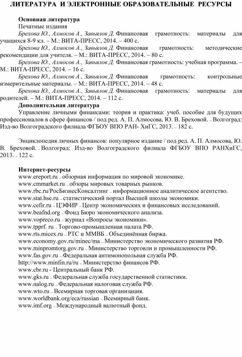 Брехова Ю., Алмосов А., Завьялов Д. Финансовая грамотность: учебная программа. – М.: ВИТА-ПРЕСС, 2014. – 16 с.