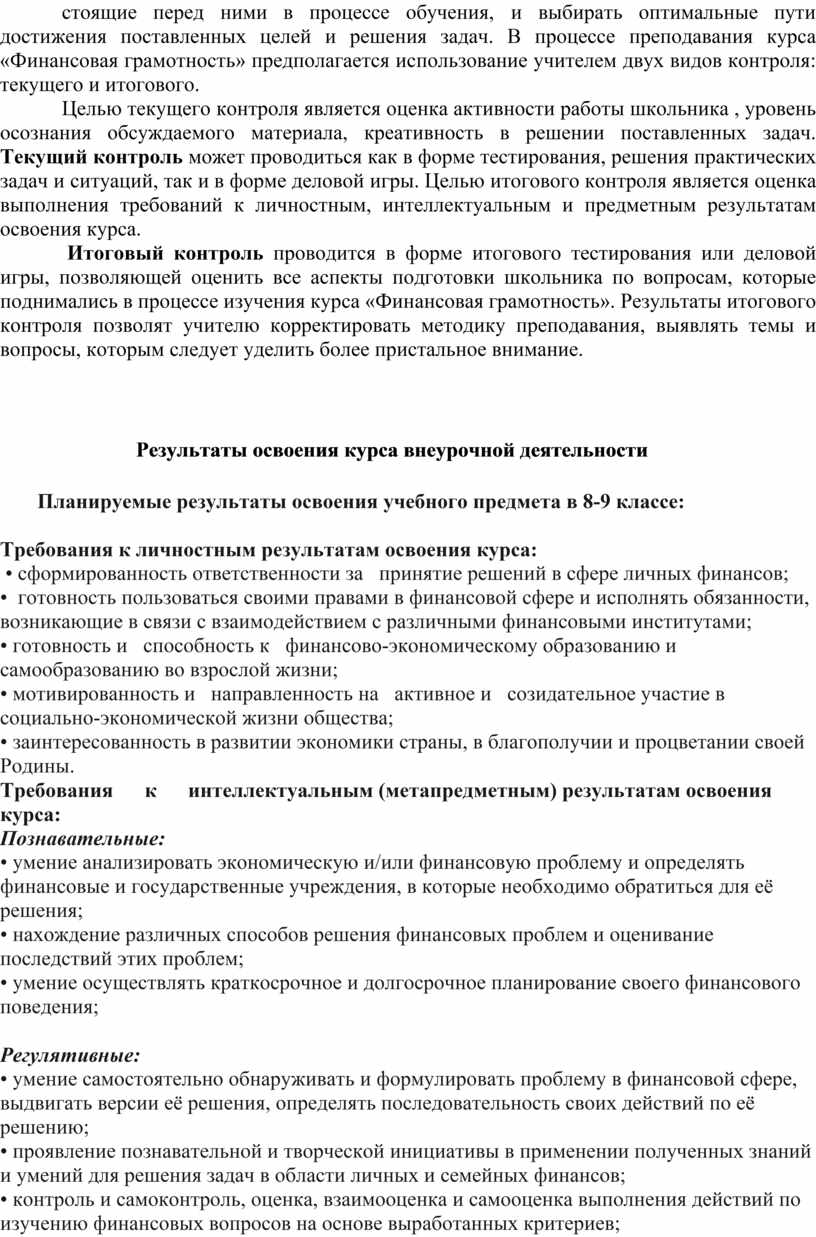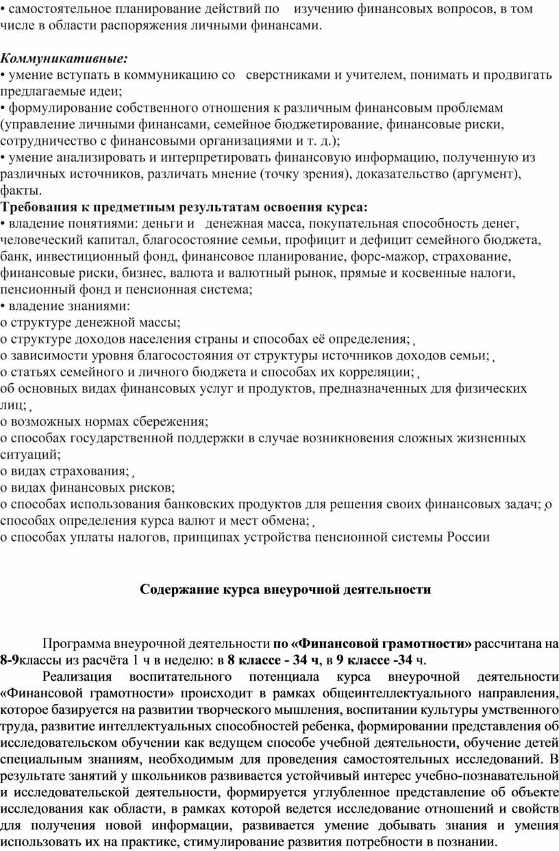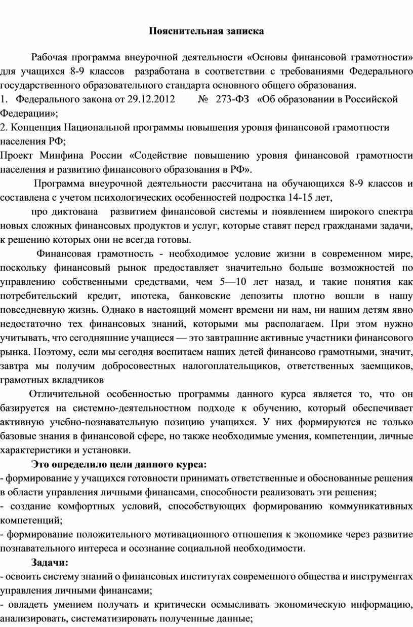Рабочая программа внеурочной деятельности «Основы финансовой грамотности» для учащихся 8-9 классов разработана в соответствии с требованиями Федерального государственного образовательного стандарта основного общего образования.