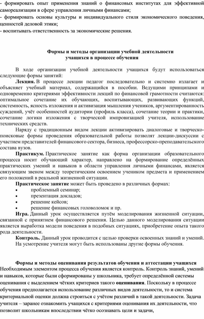 Практикум. Практическое занятие как форма организации образовательного процесса носит обучающий характер, направлено на формирование определённых практических умений и навыков в области управления личными финансами, является связующим звеном между теоретическим освоением учеником предмета и применением его положений в реальной жизненной ситуации.