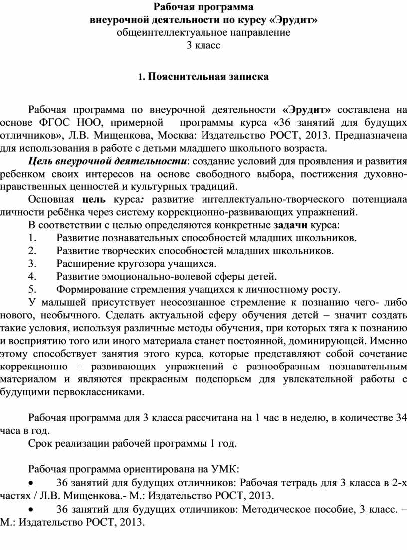 Рабочая программа по внеурочной деятельности «Эрудит» составлена на основе ФГОС НОО, примерной программы курса «36 занятий для будущих отличников», Л.В. Мищенкова, Москва: Издательство РОСТ, 2013. Предназначена для использования в работе с детьми младшего школьного возраста.