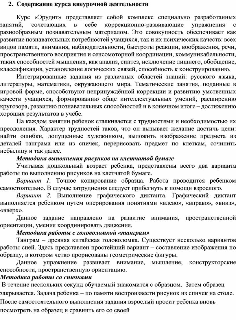Курс «Эрудит» представляет собой комплекс специально разработанных занятий, сочетающих в себе коррекционно-развивающие упражнения с разнообразным познавательным материалом. Это совокупность обеспечивает как развитие познавательных потребностей учащихся, так и их психических качеств: всех видов памяти, внимания, наблюдательности, быстроты реакции, воображения, речи, пространственного восприятия и сенсомоторной координации, коммуникабельности, таких способностей мышления, как анализ, синтез, исключение лишнего, обобщение, классификация, установление логических связей, способность к конструированию.