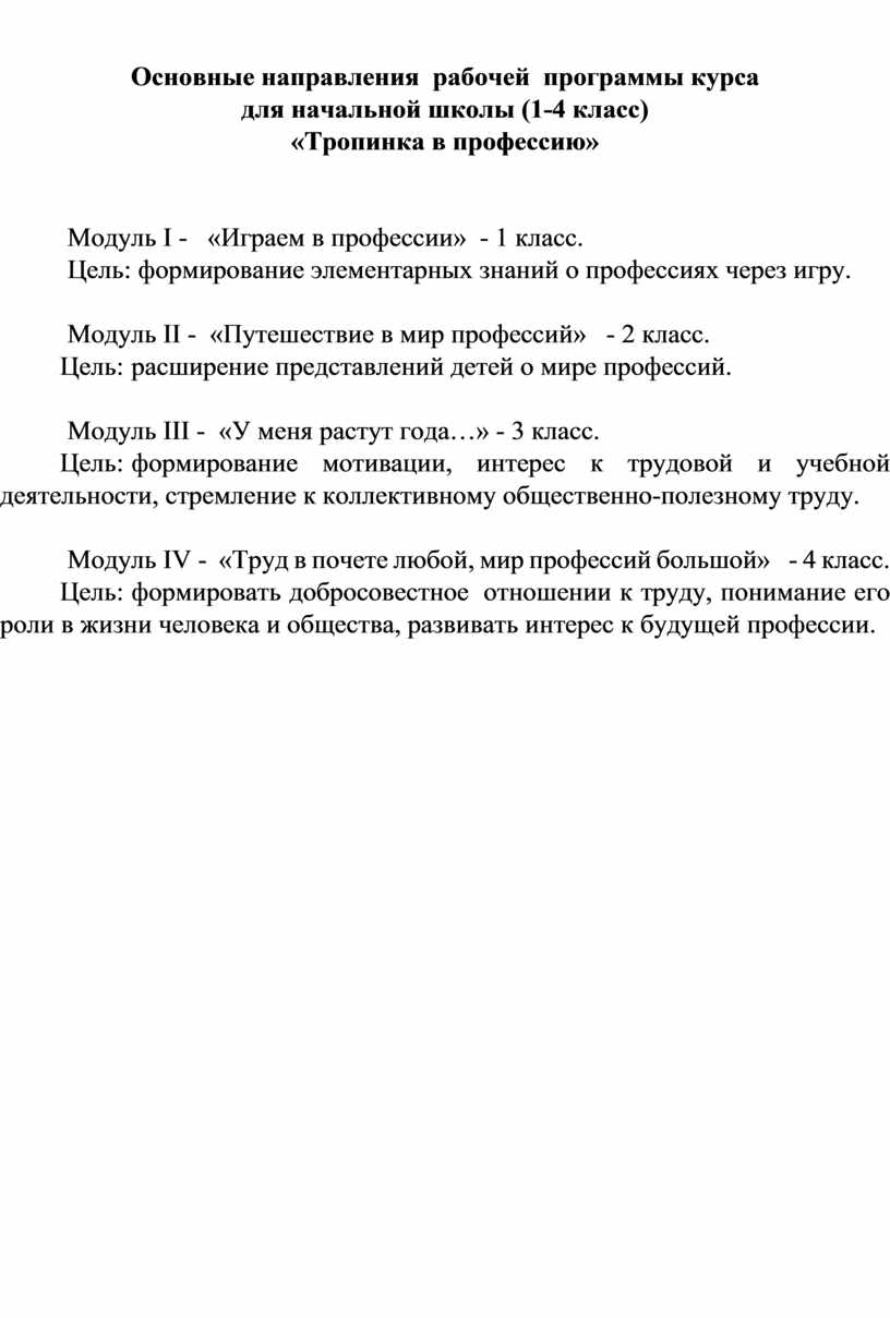 Рабочая программа курса «Тропинка в профессию» реализует направление духовно-нравственное во внеурочной деятельности в рамках ФГОС начального общего образования.
