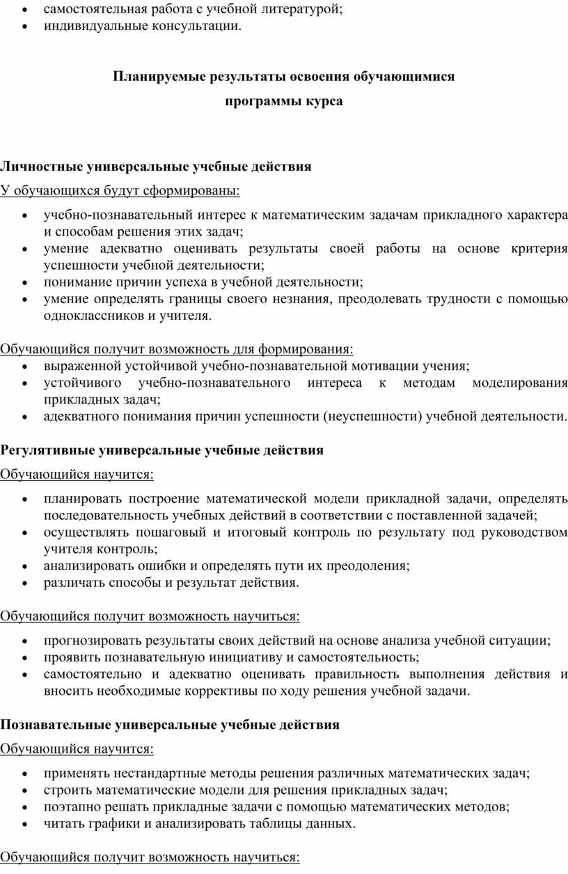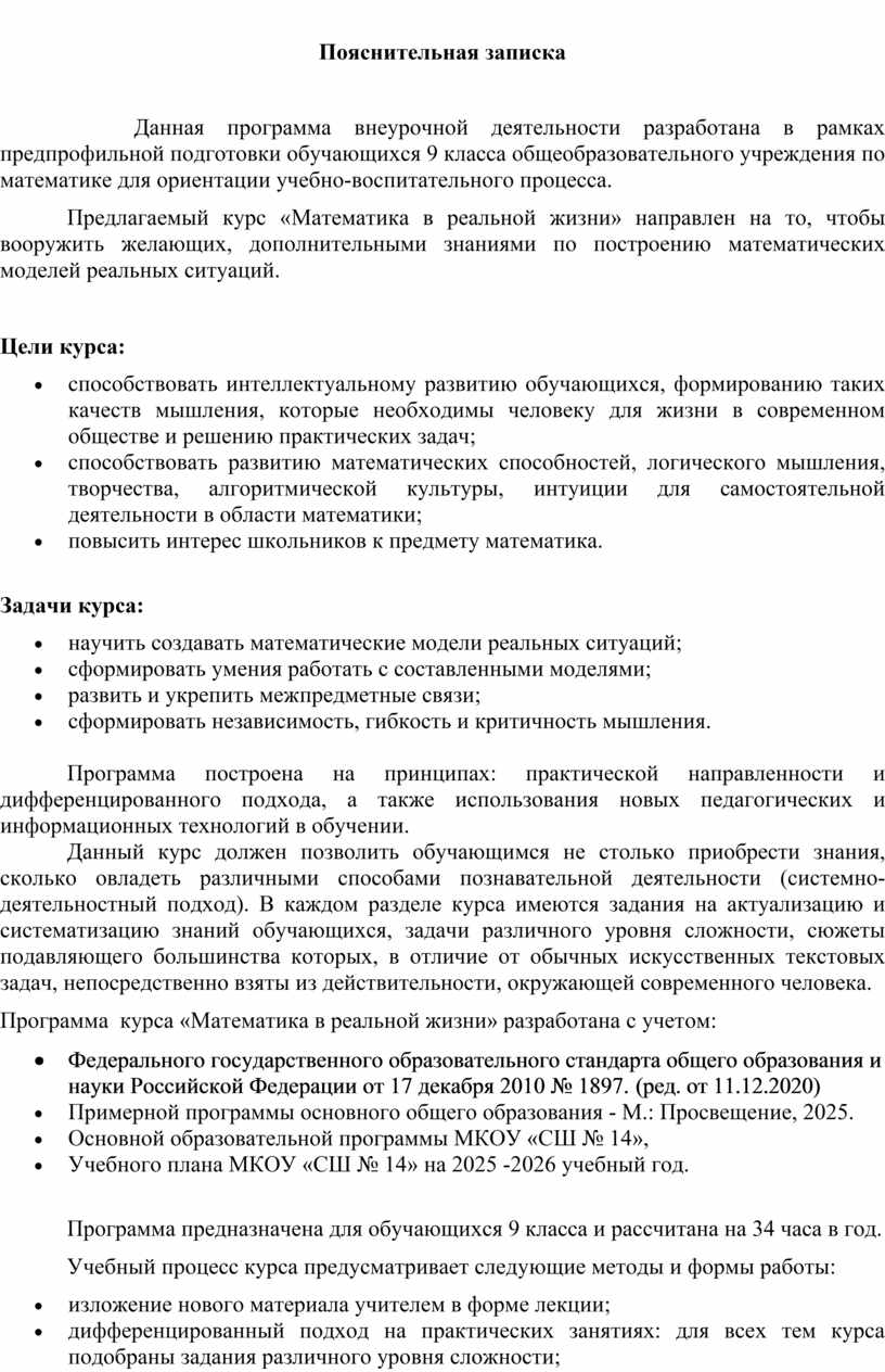 Программа курса «Математика в реальной жизни» разработана с учетом: