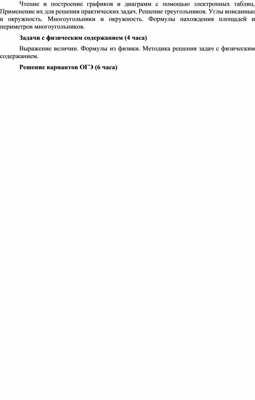Чтение и построение графиков и диаграмм с помощью электронных таблиц. Применение их для решения практических задач. Решение треугольников. Углы вписанные в окружность. Многоугольники и окружность. Формулы нахождения площадей и периметров многоугольников.