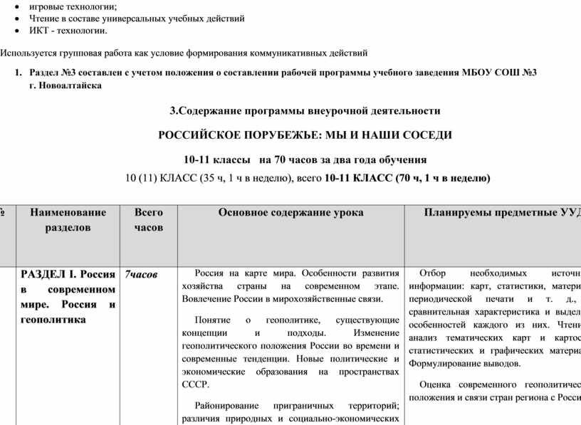 2. Примерной рабочей программы по учебному курсу «Российское Порубежье: мы и наши соседи» для 10-11 классов, расположенной в сборнике РОССИЙСКОЕ ПОРУБЕЖЬЕ: МЫ И НАШИ СОСЕДИ МЕТОДИЧЕСКИЕ РЕКОМЕНДАЦИИ 10-11 КЛАССЫ; Авторы: д-р геогр. наук В. Л. Бабурин, канд. геогр. наук А. И. Даньшин, канд. пед. наук Л. И. Елховская; Москва «Просвещение» 2017