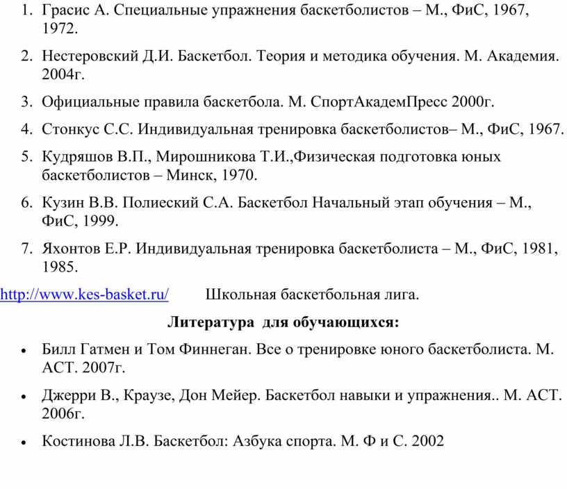 2. Грасис А. Специальные упражнения баскетболистов – М., ФиС, 1967, 1972.