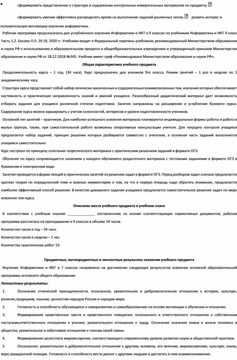 Рабочая программа предназначена для углублённого изучения Информатики и ИКТ в 9 классах по учебникам Информатика и ИКТ 9 класс Часть 1,2. Босова Л.Л. 20 19, 2020 гг. Учебники входят в Федеральный перечень учебников, рекомендованный Министерством образования и науки РФ к использованию в образовательном процессе в общеобразовательных учреждениях и утвержденный приказом Министерства образования и науки РФ от 28.12.2018 №345. Учебник имеет гриф «Рекомендовано Министерством образования и науки РФ».