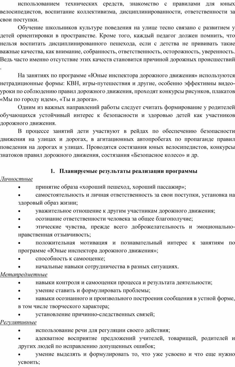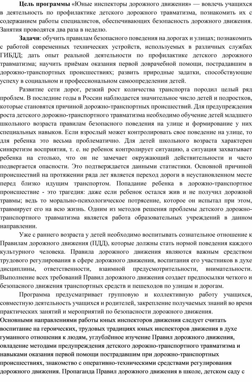 Цель программы «Юные инспекторы дорожного движения» — вовлечь учащихся в деятельность по профилактике детского дорожного травматизма, познакомить их с содержанием работы специалистов, обеспечивающих безопасность дорожного движения. Занятия проводятся два раза в неделю.