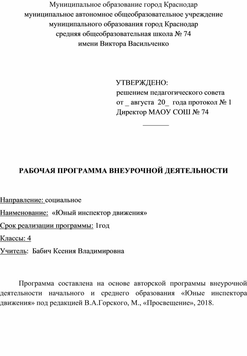 Программа составлена на основе авторской программы внеурочной деятельности начального и среднего образования «Юные инспектора движения» под редакцией В.А.Горского, М., «Просвещение», 2018.