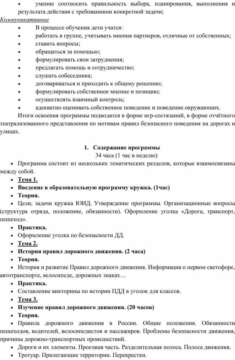 Программа предусматривает групповую и коллективную работу учащихся, совместную деятельность учащихся и родителей, закрепление получаемых знаний во время практических занятий и мероприятий по безопасности дорожного движения.