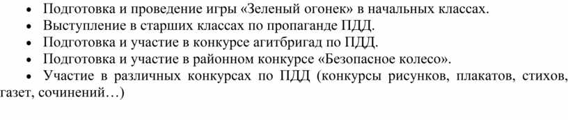 В процессе занятий дети участвуют в рейдах по обеспечению безопасности движения на улицах и дорогах, в агитационных автопробегах по пропаганде правил поведения на дорогах и улицах. Проводятся состязания юных велосипедистов, конкурсы знатоков правил дорожного движения, состязания «Безопасное колесо» и др.