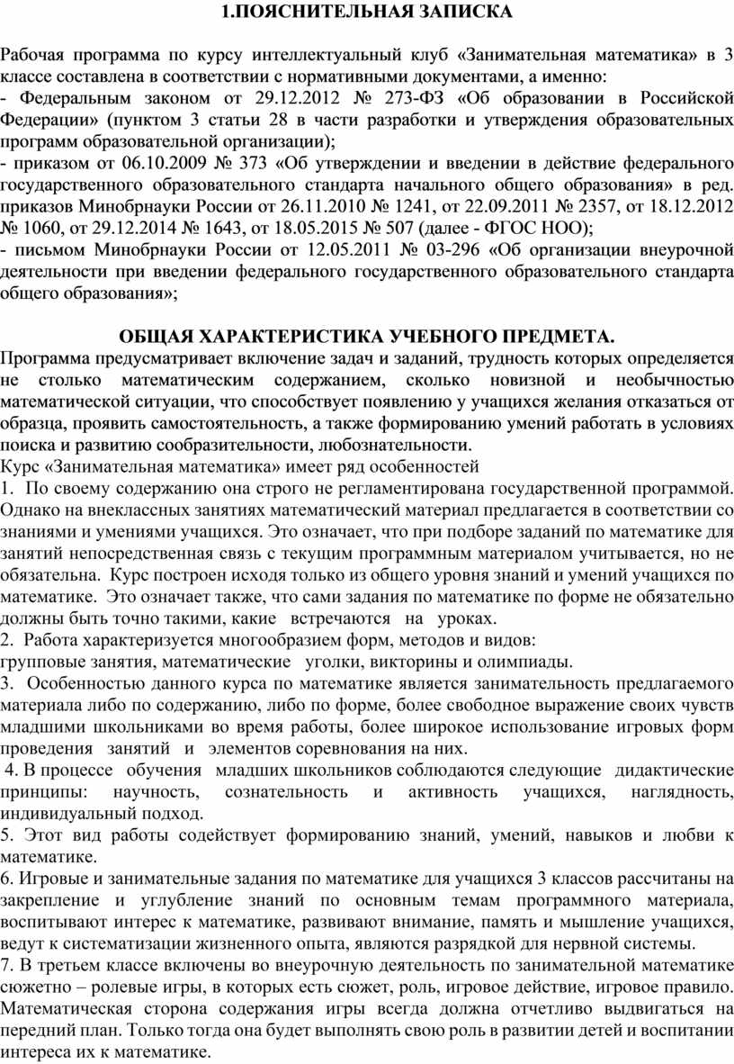 Рабочая программа по курсу интеллектуальный клуб «Занимательная математика» в 3 классе составлена в соответствии с нормативными документами, а именно: