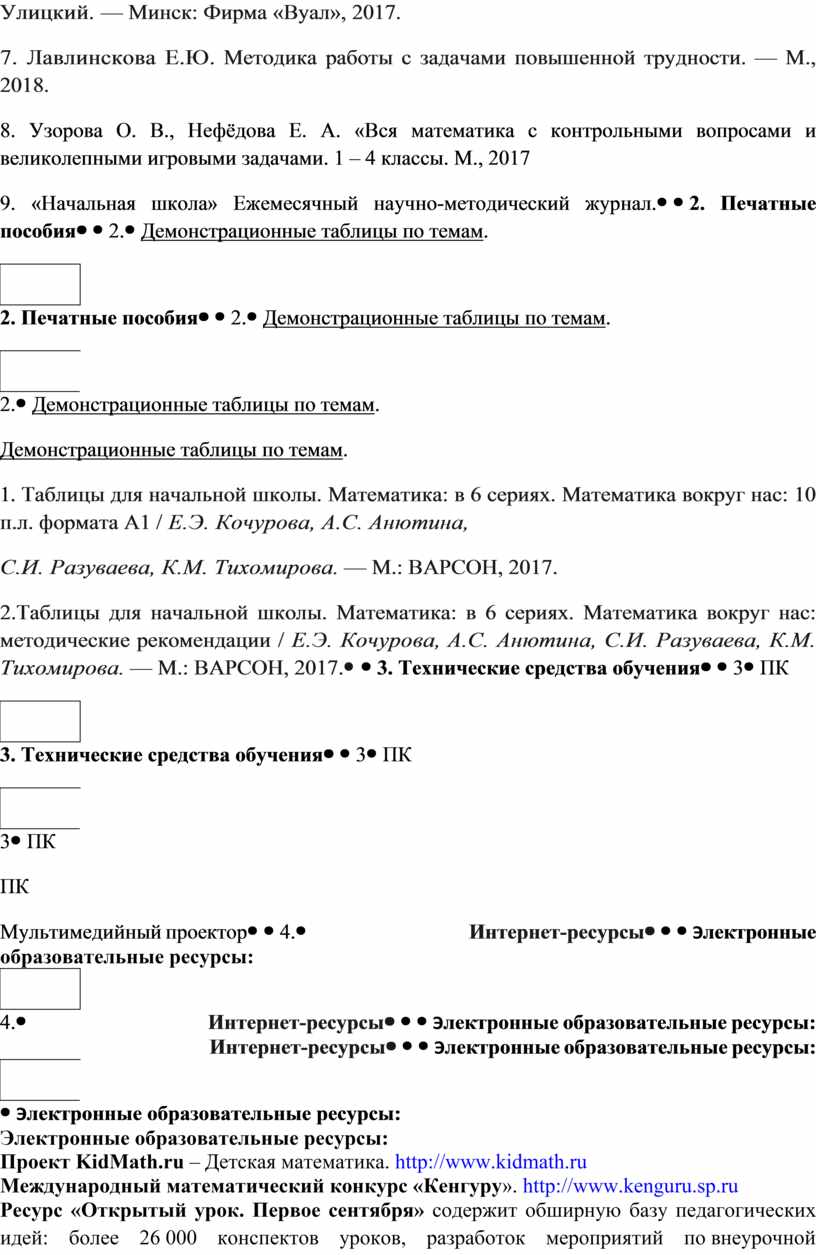 Демонстрационные таблицы по темам. 1. Таблицы для начальной школы. Математика: в 6 сериях. Математика вокруг нас: 10 п.л. формата А1 / Е.Э. Кочурова, А.С. Анютина, С.И. Разуваева, К.М. Тихомирова. — М.: ВАРСОН, 2017. 2.Таблицы для начальной школы. Математика: в 6 сериях. Математика вокруг нас: методические рекомендации / Е.Э. Кочурова, А.С. Анютина, С.И. Разуваева, К.М. Тихомирова. — М.: ВАРСОН, 2017. |