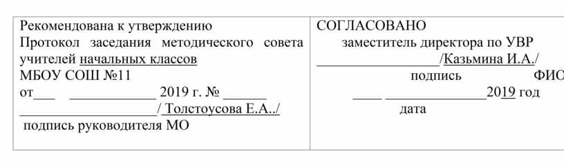 Рекомендована к утверждению Протокол заседания методического совета учителей начальных классов МБОУ СОШ №11 от___ ____________ 2019 г. № ______ ___________________/ Толстоусова Е.А../ подпись руководителя МО