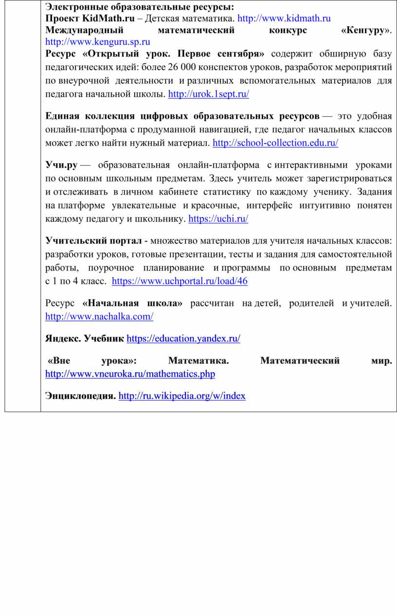 Электронные образовательные ресурсы: Проект KidMath.ru – Детская математика. http://www.kidmath.ru Международный математический конкурс «Кенгуру». http://www.kenguru.sp.ru Ресурс «Открытый урок. Первое сентября» содержит обширную базу педагогических идей: более 26 000 конспектов уроков, разработок мероприятий по внеурочной деятельности и различных вспомогательных материалов для педагога начальной школы. http://urok.1sept.ru/ Единая коллекция цифровых образовательных ресурсов — это удобная онлайн-платформа с продуманной навигацией, где педагог начальных классов может легко найти нужный материал. http://school-collection.edu.ru/ Учи.ру — образовательная онлайн-платформа с интерактивными уроками по основным школьным предметам. Здесь учитель может зарегистрироваться и отслеживать в личном кабинете статистику по каждому ученику. Задания на платформе увлекательные и красочные, интерфейс интуитивно понятен каждому педагогу и школьнику. https://uchi.ru/ Учительский портал - множество материалов для учителя начальных классов: разработки уроков, готовые презентации, тесты и задания для самостоятельной работы, поурочное планирование и программы по основным предметам с 1 по 4 класс. https://www.uchportal.ru/load/46 Ресурс «Начальная школа» рассчитан на детей, родителей и учителей. http://www.nachalka.com/ Яндекс. Учебник https://education.yandex.ru/ «Вне урока»: Математика. Математический мир. http://www.vneuroka.ru/mathematics.php Энциклопедия. http://ru.wikipedia.org/w/index |