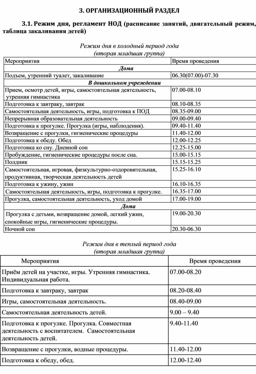 3.1. Режим дня, регламент НОД (расписание занятий, двигательный режим, таблица закаливания детей)