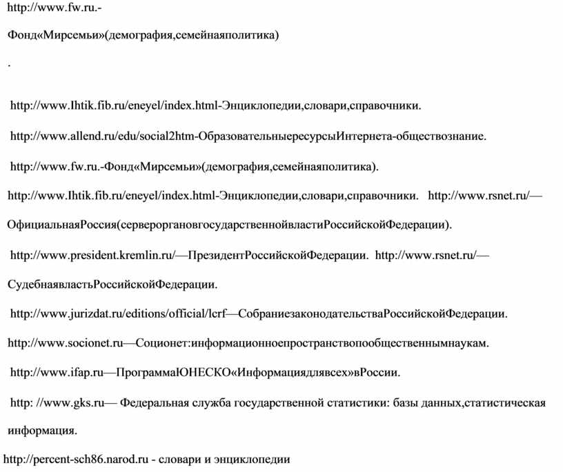 http://www.fw.ru.-Фонд«Мирсемьи»(демография,семейнаяполитика). http://www.Ihtik.fib.ru/eneyel/index.html-Энциклопедии,словари,справочники. http://www.rsnet.ru/—