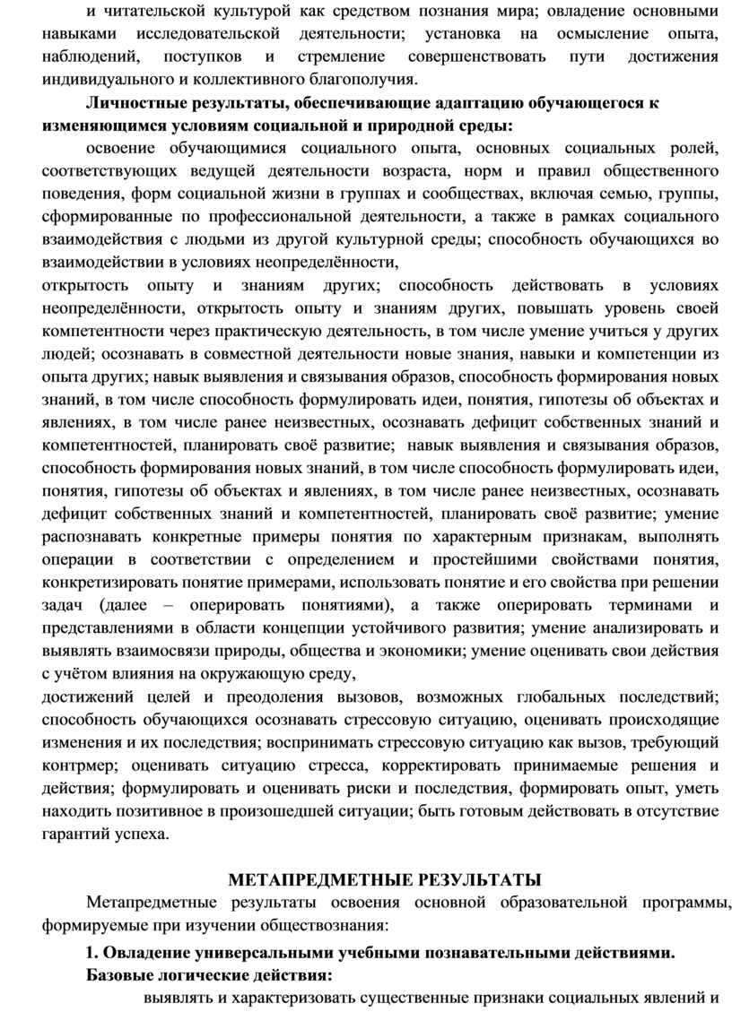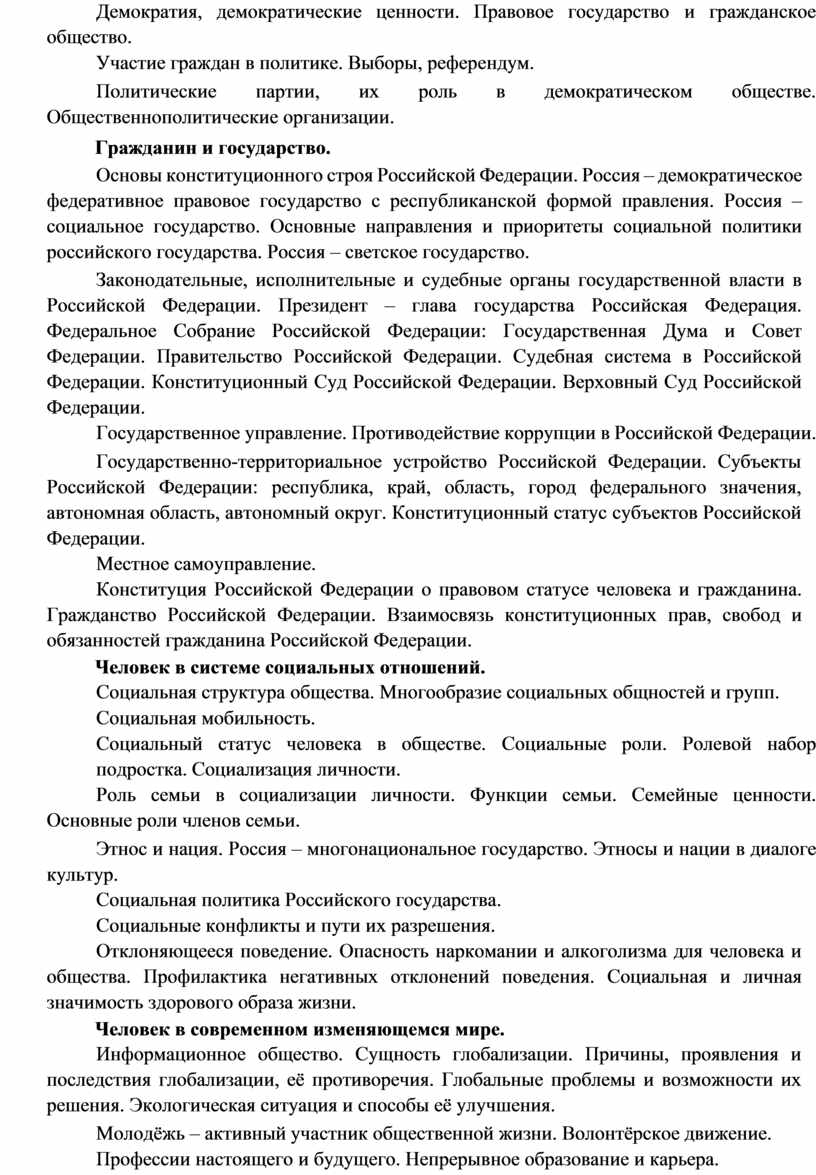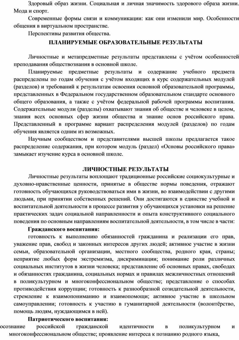 Изучение обществознания, включающего знания о российском обществе и направлениях его развития в современных условиях, об основах конституционного строя нашей страны, правах и обязанностях человека и гражданина, способствует воспитанию российской гражданской идентичности, готовности к служению Отечеству, приверженности национальным ценностям. Привлечение при изучении обществознания различных источников социальной информации помогает обучающимся освоить язык современной культурной, социально-экономической и политической коммуникации, вносит свой вклад в формирование метапредметных умений извлекать необходимые сведения, осмысливать, преобразовывать и применять их.