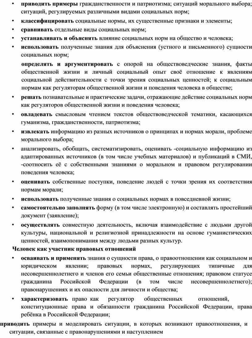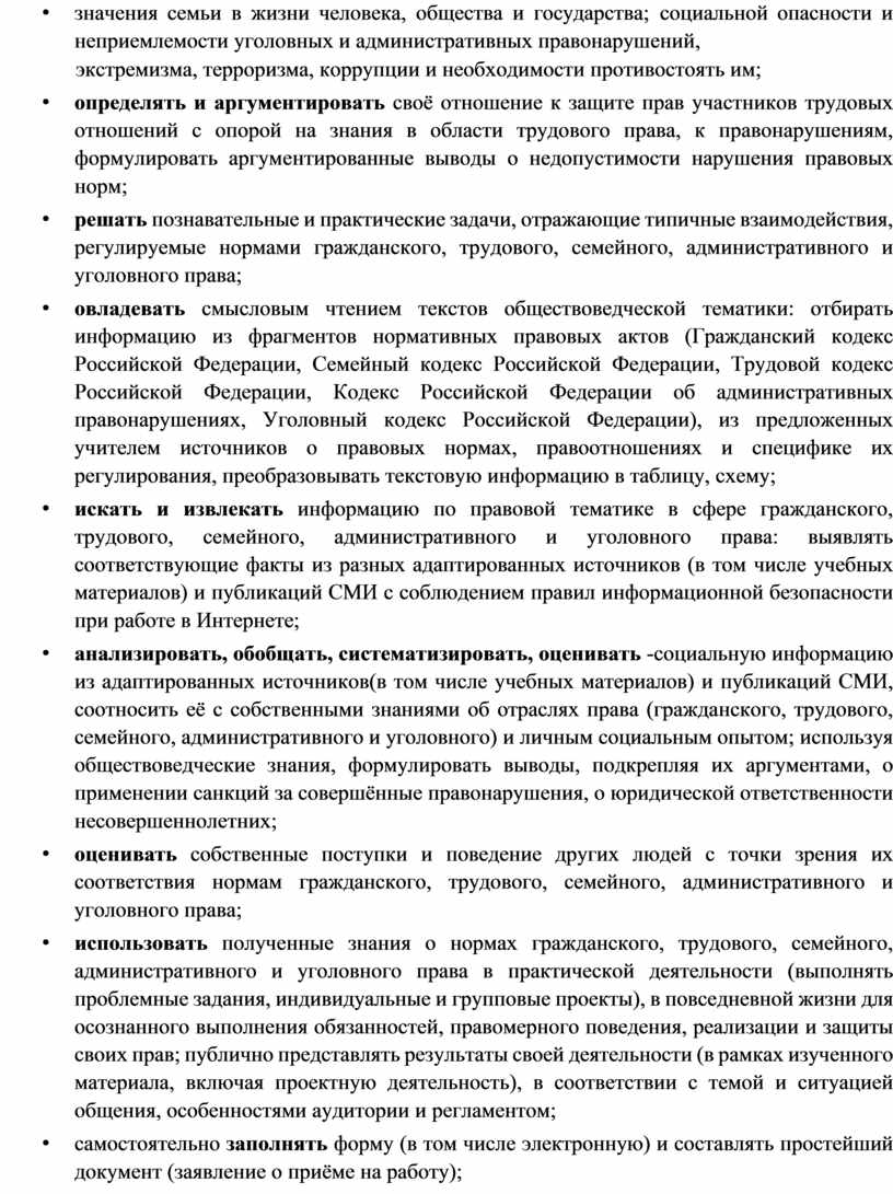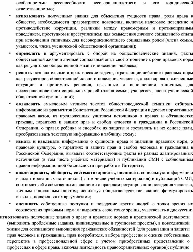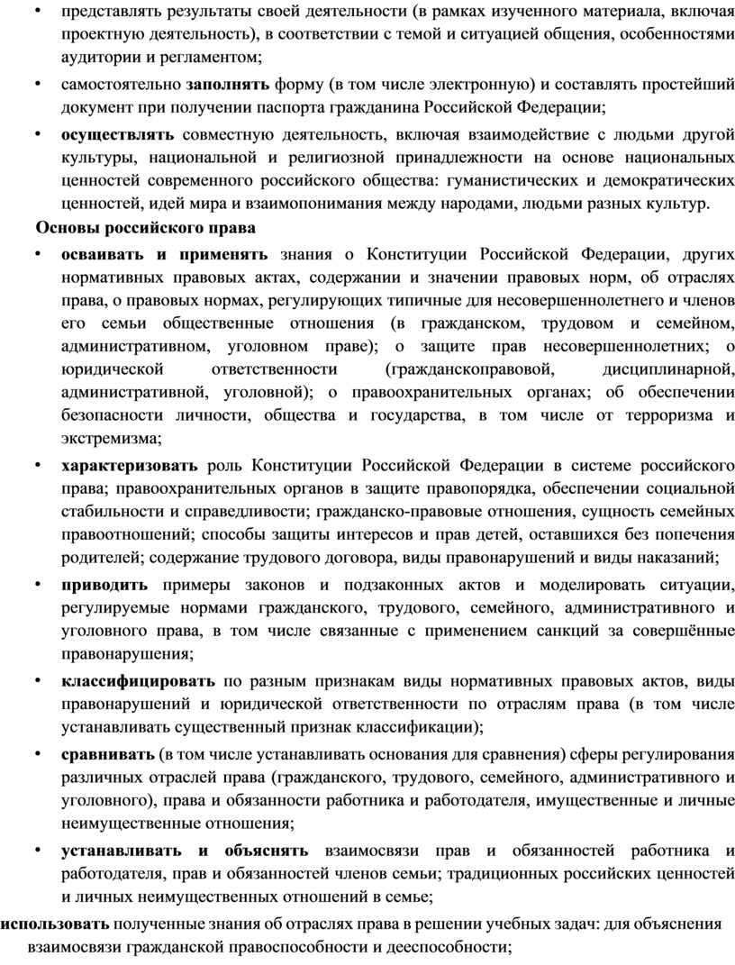 • формирование опыта применения полученных знаний и умений для выстраивания отношений между людьми различных национальностей и вероисповеданий в общегражданской и в семейно-бытовой сферах; для соотнесения своих действий и действий других людей с нравственными ценностями и нормами поведения, установленными законом; содействия правовыми способами и средствами защите правопорядка в обществе.