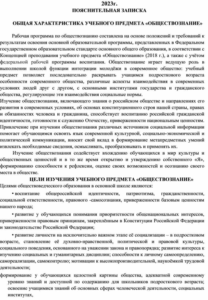 Рабочая программа по обществознанию составлена на основе положений и требований к результатам освоения основной образовательной программы, представленных в Федеральном государственном образовательном стандарте основного общего образования, в соответствии с Концепцией преподавания учебного предмета «Обществознание» (2018 г.), а также с учётом федеральной рабочей программы воспитания. Обществознание играет ведущую роль в выполнении школой функции интеграции молодёжи в современное общество: учебный предмет позволяет последовательно раскрывать учащимся подросткового возраста особенности современного общества, различные аспекты взаимодействия в современных условиях людей друг с другом, с основными институтами государства и гражданского общества, регулирующие эти взаимодействия социальные нормы.