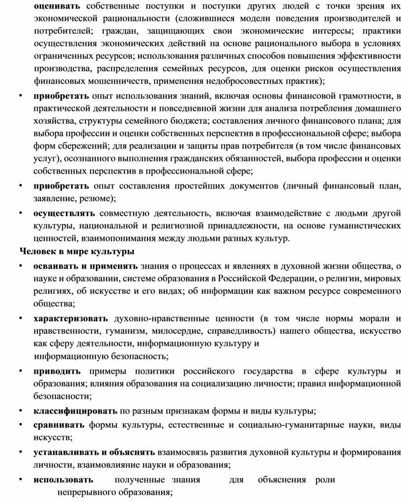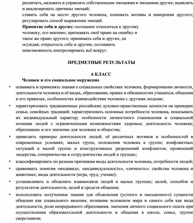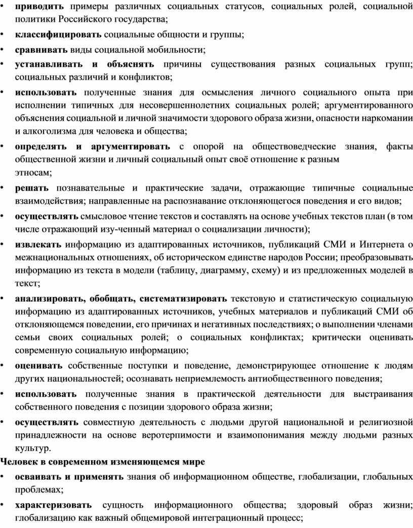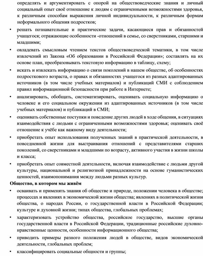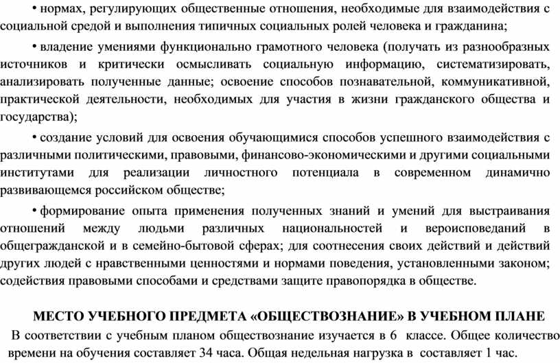 • формирование у обучающихся целостной картины общества, адекватной современному уровню знаний и доступной по содержанию для школьников подросткового возраста; освоение учащимися знаний об основных сферах человеческой деятельности, социальных институтах, нормах, регулирующих общественные отношения, необходимые для взаимодействия с социальной средой и выполнения типичных социальных ролей человека и гражданина;