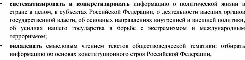 • развитие у обучающихся понимания приоритетности общенациональных интересов, приверженности правовым принципам, закреплённым в Конституции Российской Федерации и законодательстве Российской Федерации;
