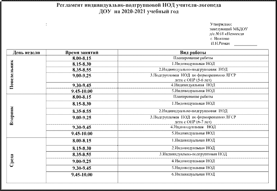 • Регламент индивидуально-подгрупповой логопедической НОД ДОУ
