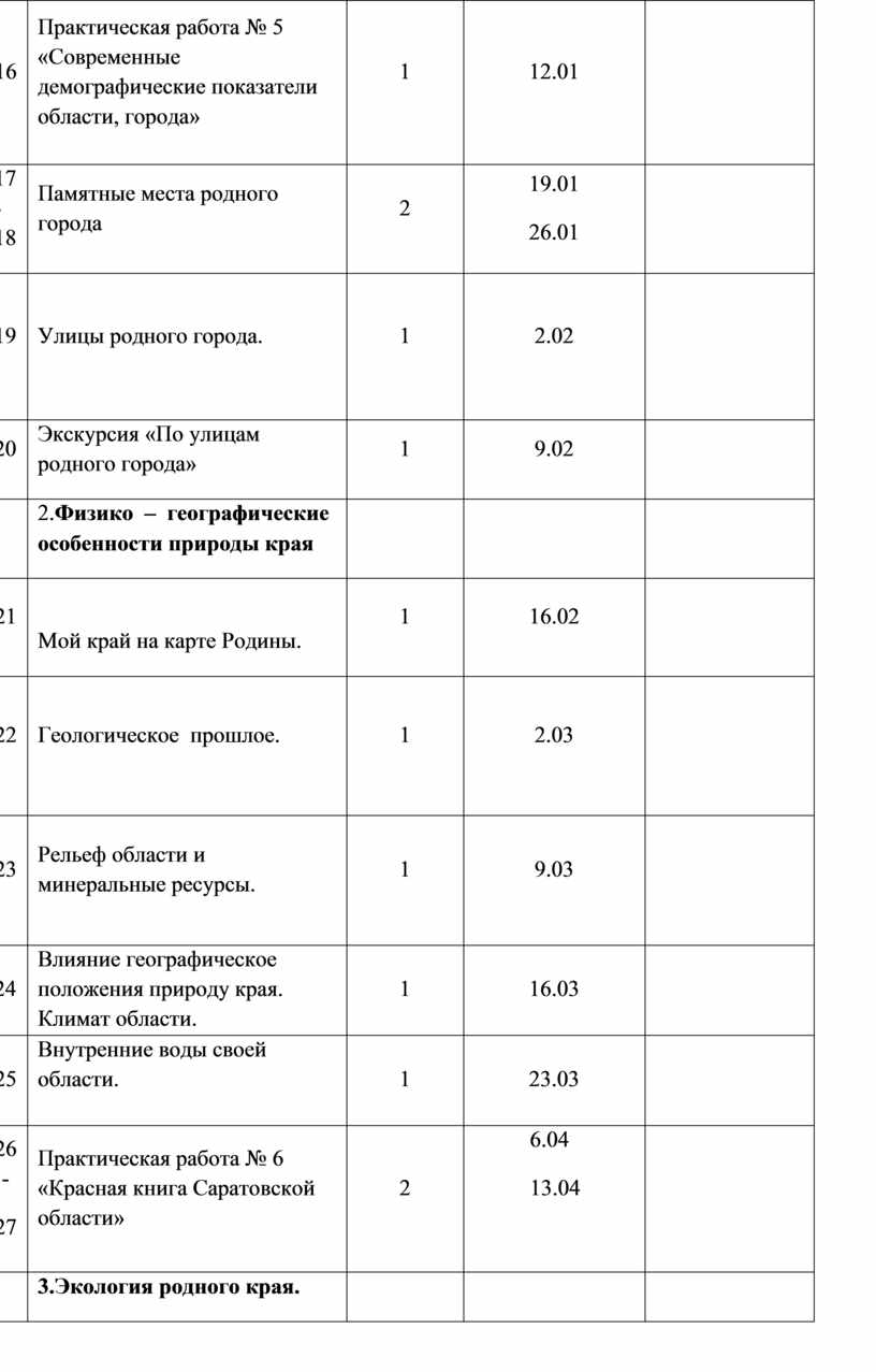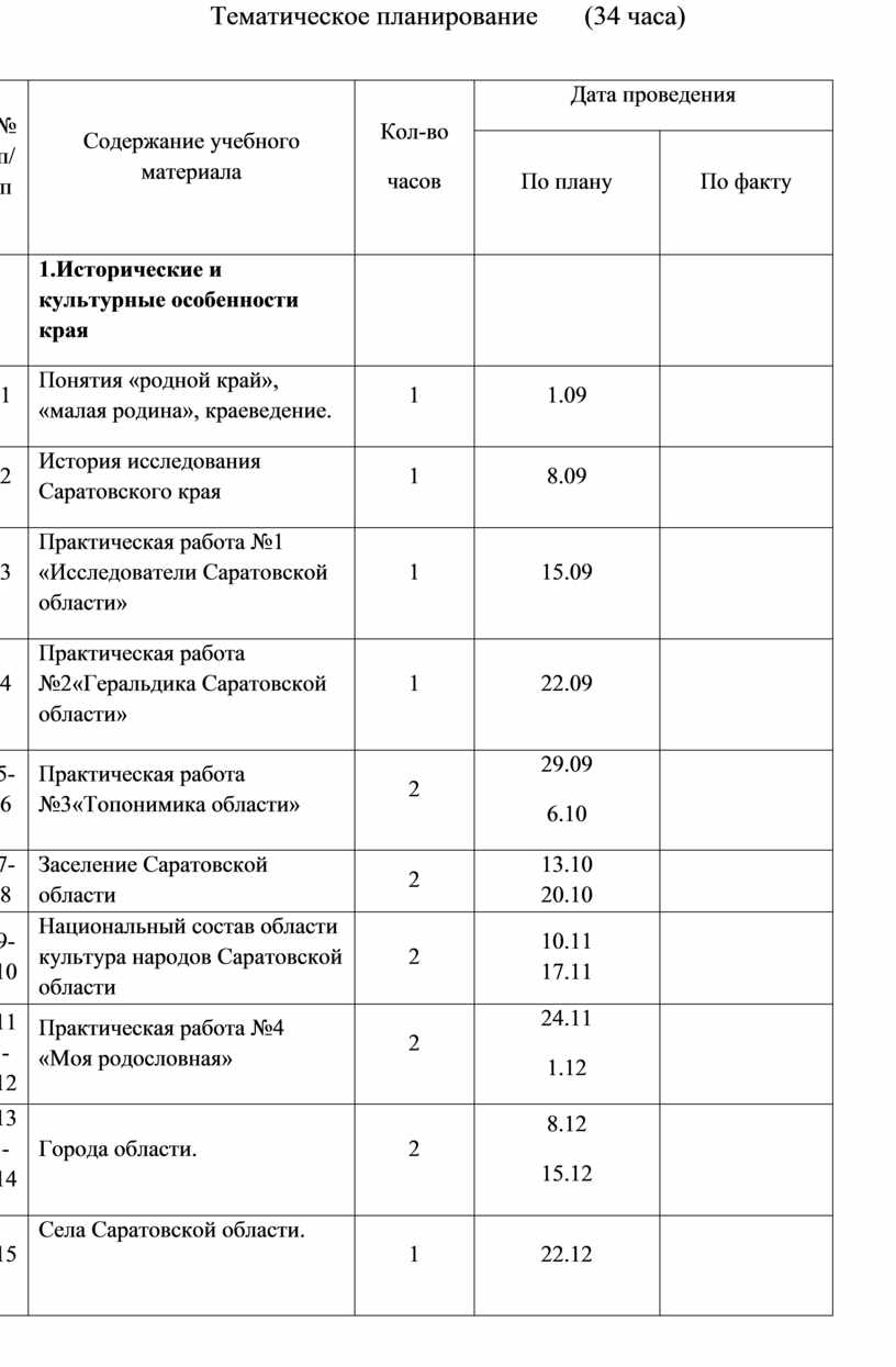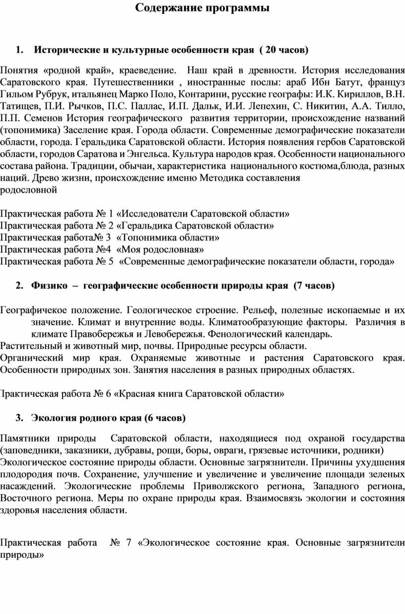 Понятия «родной край», краеведение. Наш край в древности. История исследования Саратовского края. Путешественники , иностранные послы: араб Ибн Батут, француз Гильом Рубрук, итальянец Марко Поло, Контарини, русские географы: И.К. Кириллов, В.Н. Татищев, П.И. Рычков, П.С. Паллас, И.П. Дальк, И.И. Лепехин, С. Никитин, А.А. Тилло, П.П. Семенов История географического развития территории, происхождение названий (топонимика) Заселение края. Города области. Современные демографические показатели области, города. Геральдика Саратовской области. История появления гербов Саратовской области, городов Саратова и Энгельса. Культура народов края. Особенности национального состава района. Традиции, обычаи, характеристика национального костюма,блюда, разных наций. Древо жизни, происхождение именю Методика составления
