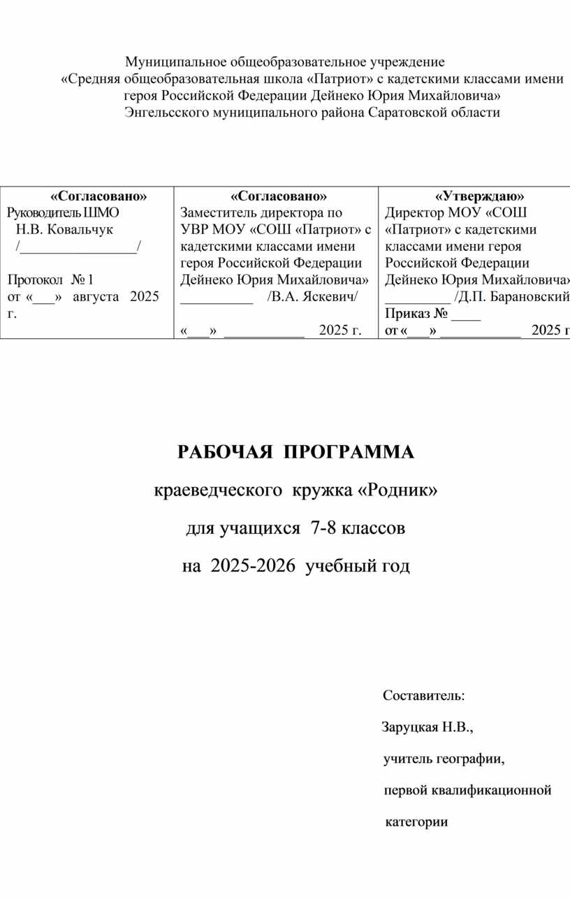 «Утверждаю» Директор МОУ «СОШ «Патриот» с кадетскими классами имени героя Российской Федерации Дейнеко Юрия Михайловича» _________ /Д.П. Барановский/ Приказ № ____ от «___» ___________ 2025 г. |