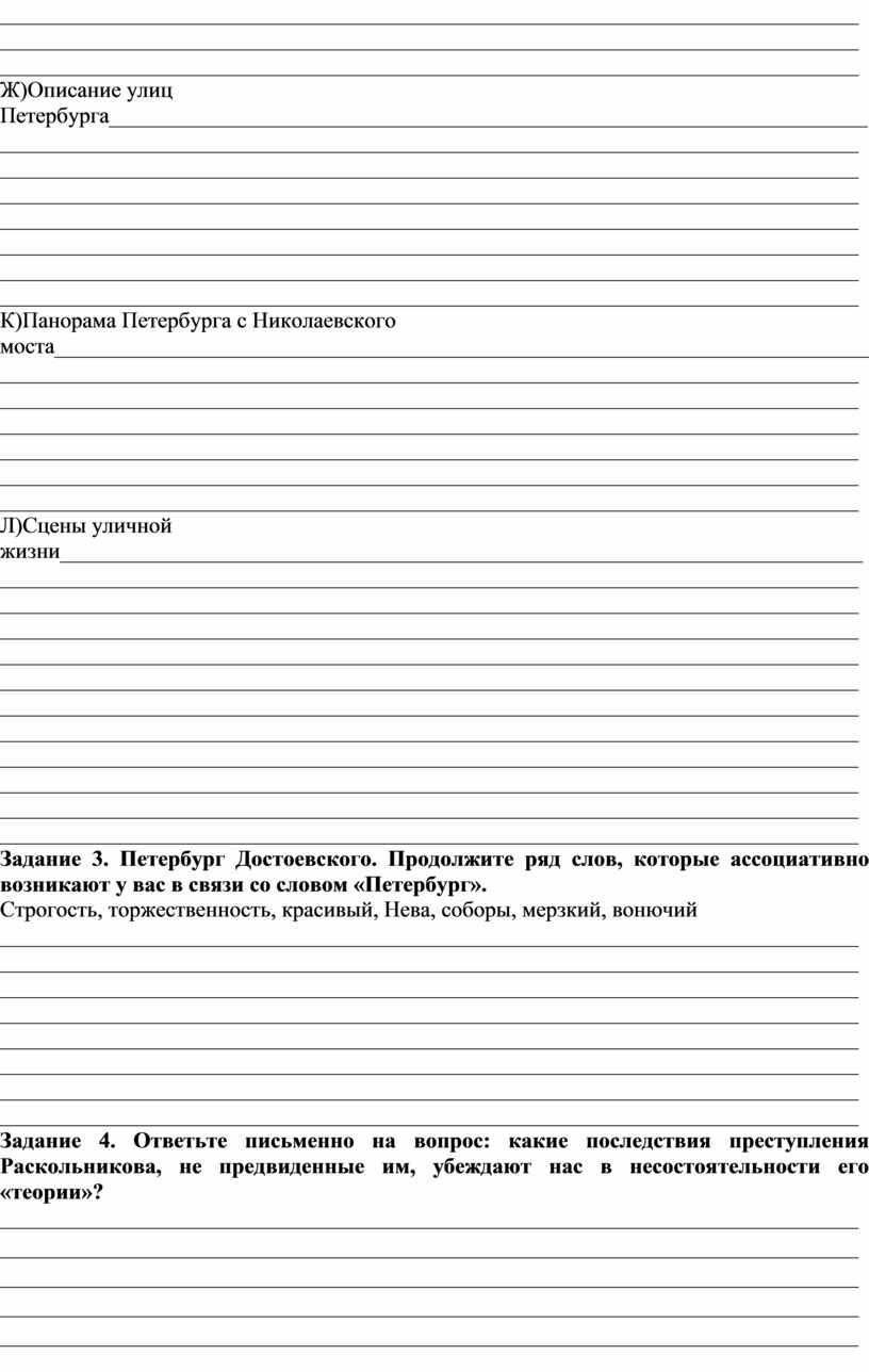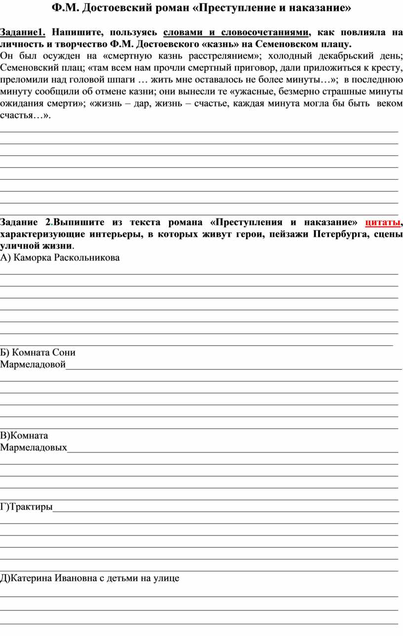 Задание 2.Выпишите из текста романа «Преступления и наказание» цитаты, характеризующие интерьеры, в которых живут герои, пейзажи Петербурга, сцены уличной жизни.