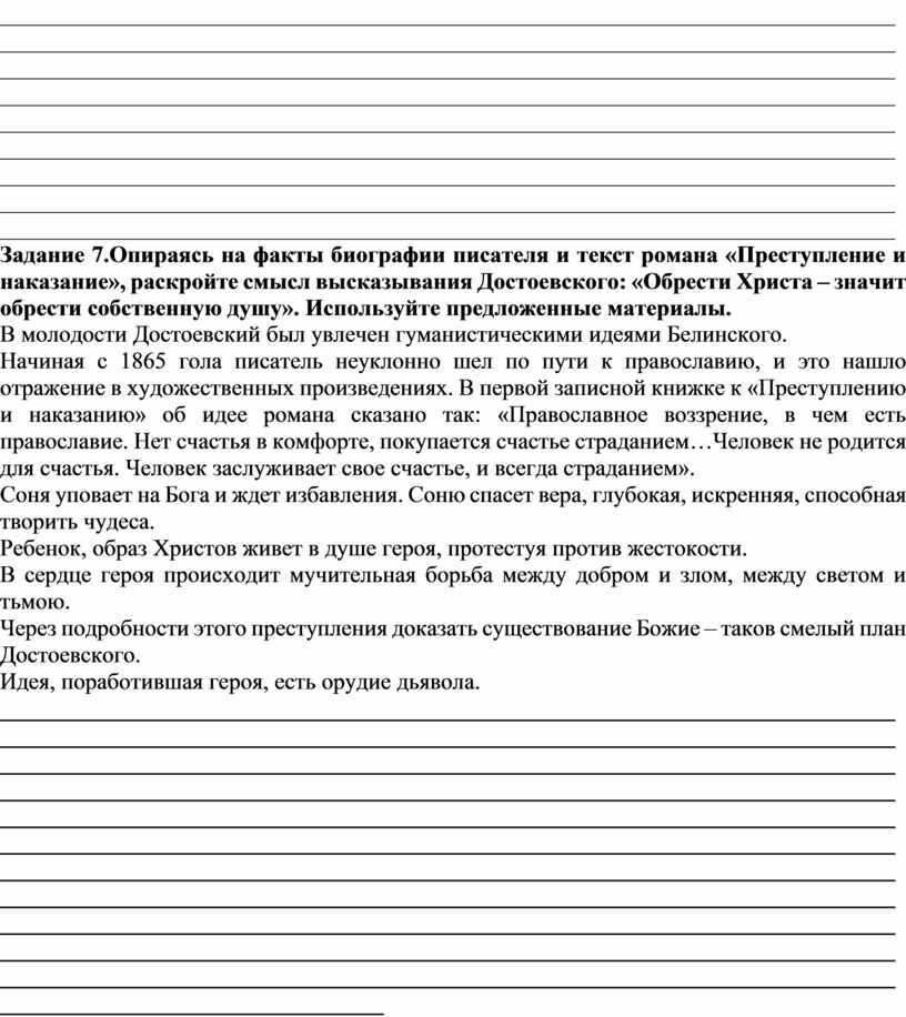Задание 7.Опираясь на факты биографии писателя и текст романа «Преступление и наказание», раскройте смысл высказывания Достоевского: «Обрести Христа – значит обрести собственную душу». Используйте предложенные материалы.