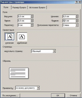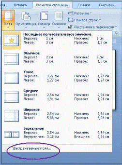 4. Для заполнения Визитки информацией необходимо определить её поля, используя параметр страницы Поля. Удобно оставить со всех сторон Визитки (слева, справа, сверху, снизу) поля по 0,5 см. Выбираем Настраиваемые поля и заполняем поля окна Параметры страницы.