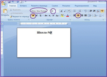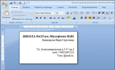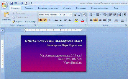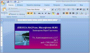 5. Заполнить Визитку информацией, используя панель форматирования вкладки Главная. По центру Шрифтом Times New Roman размером 14 жирным набрать название фирмы, организации и т.д. (пример, не имеющий отношение к специфике дисциплины: общеобразовательное учреждение, где учишься, например, школа)