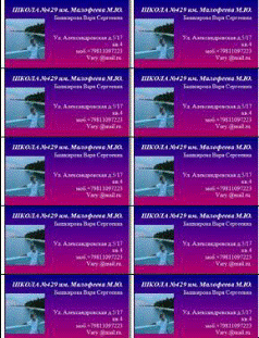 8. Для тиражирования Визитных карточек можно воспользоваться вкладкой Вставка – Таблица. Выбрать два столбца и 5 строк (на 10 Визиток). Скопировать готовую Визитку в каждую ячейку таблицы.