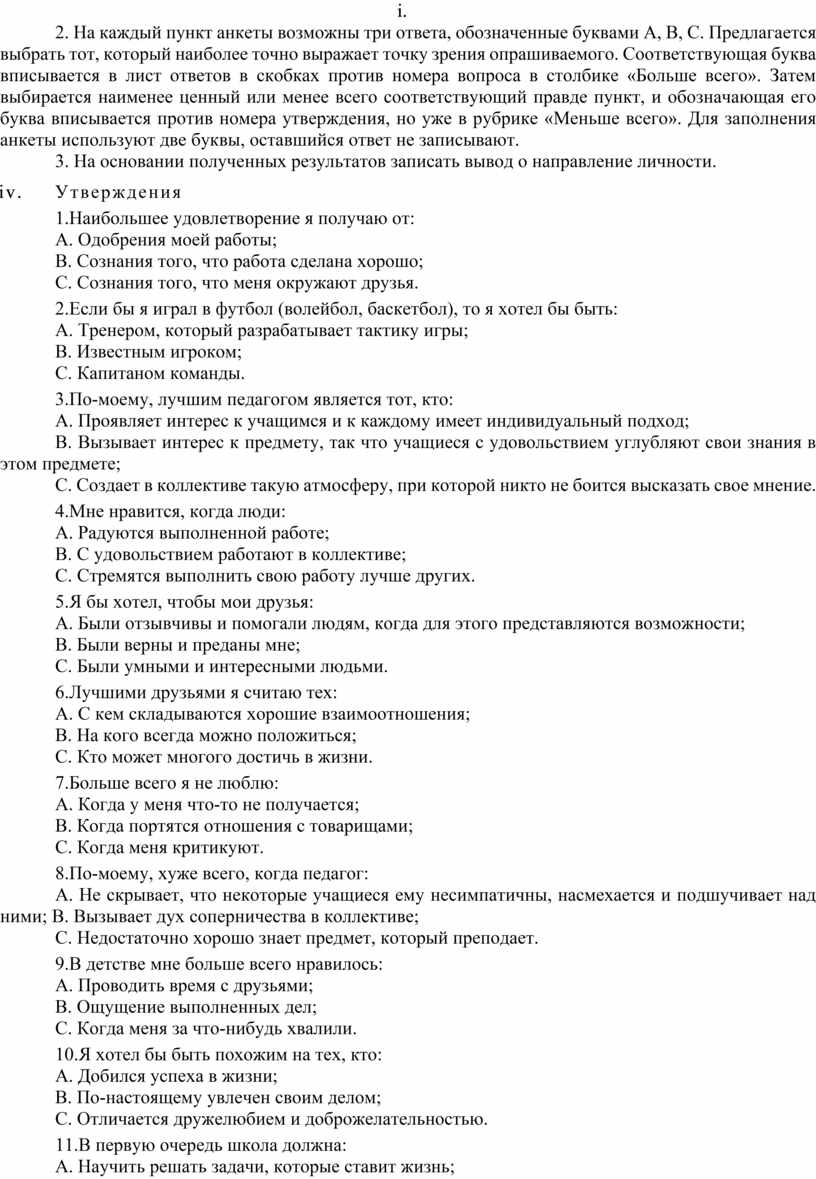 Для изучения своих ценностных ориентации, их изменения в течение жизни ответьте на вопросы следующей анкеты.