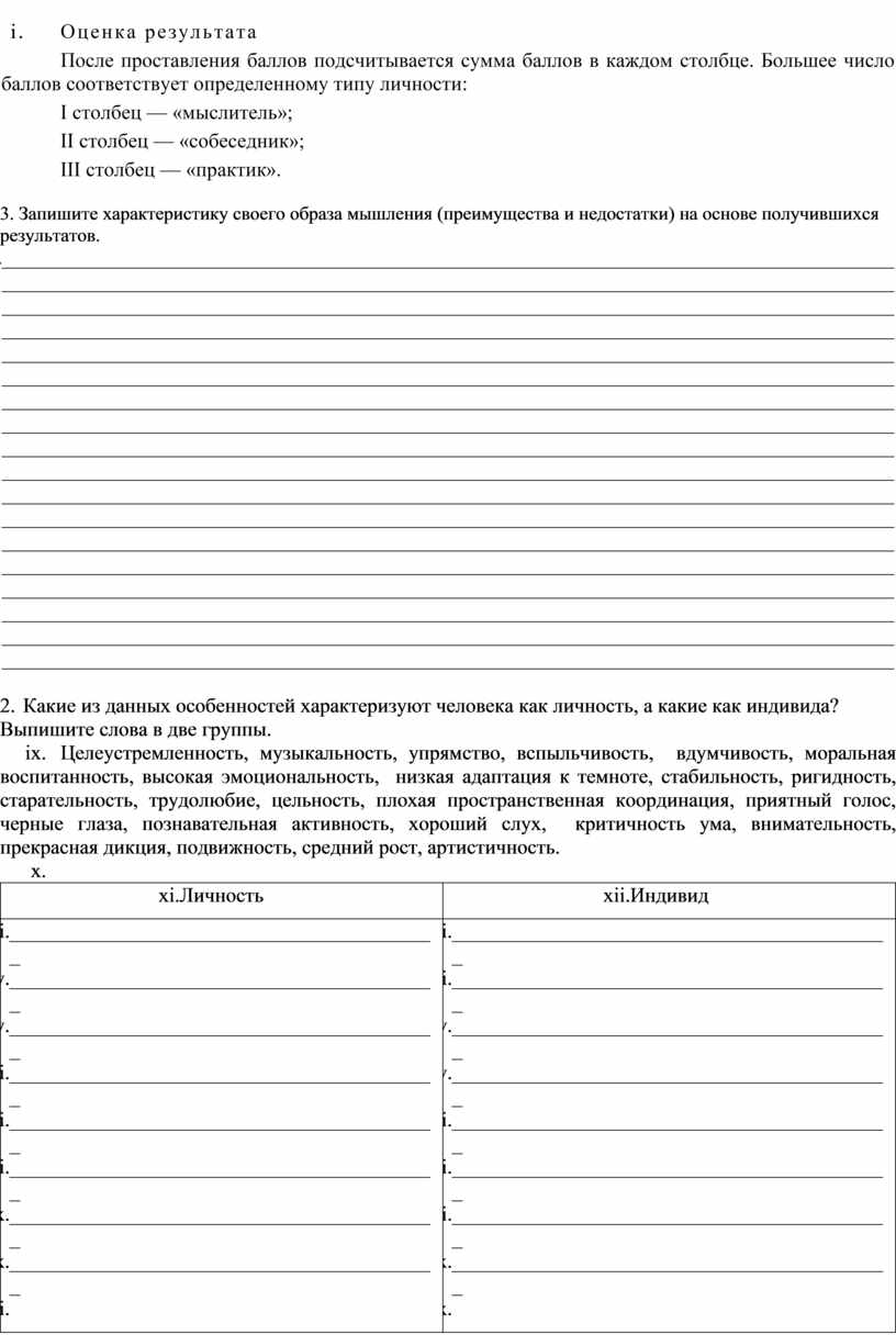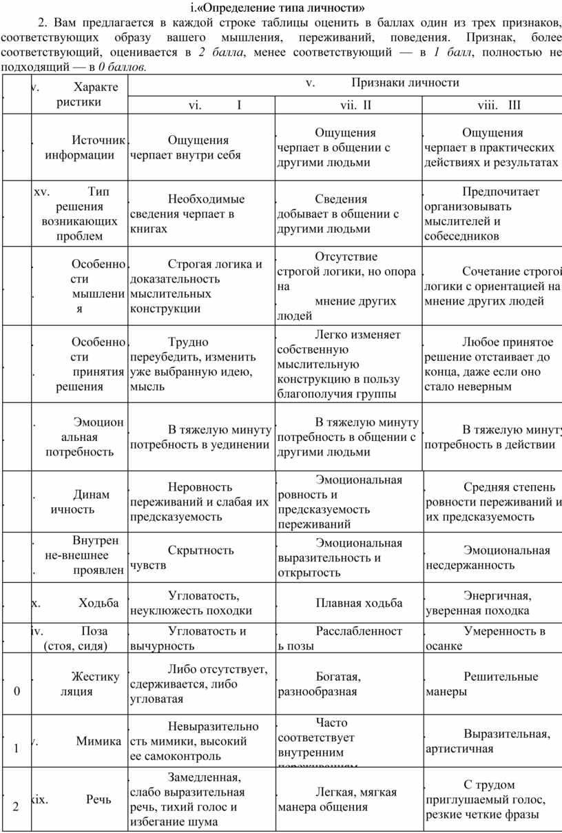 2. Вам предлагается в каждой строке таблицы оценить в баллах один из трех признаков, соответствующих образу вашего мышления, переживаний, поведения. Признак, более соответствующий, оценивается в 2 балла, менее соответствующий — в 1 балл, полностью не подходящий — в 0 баллов.