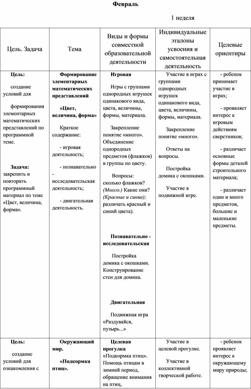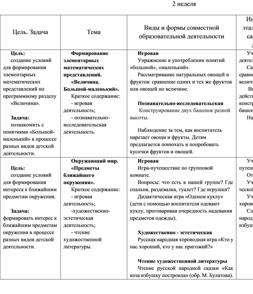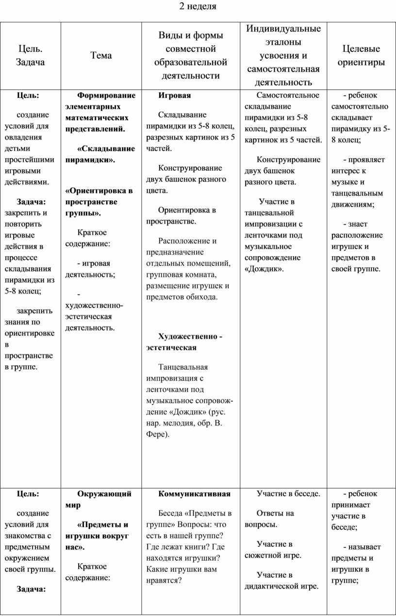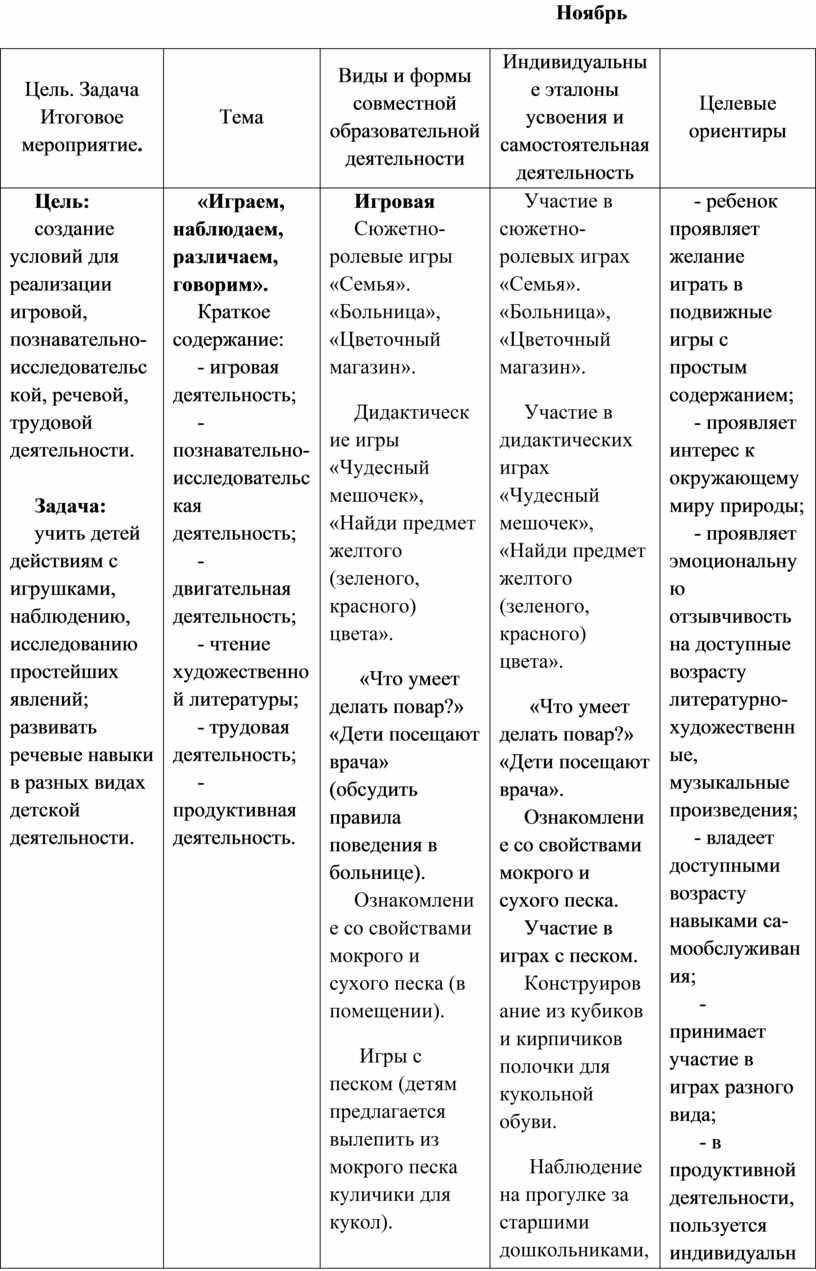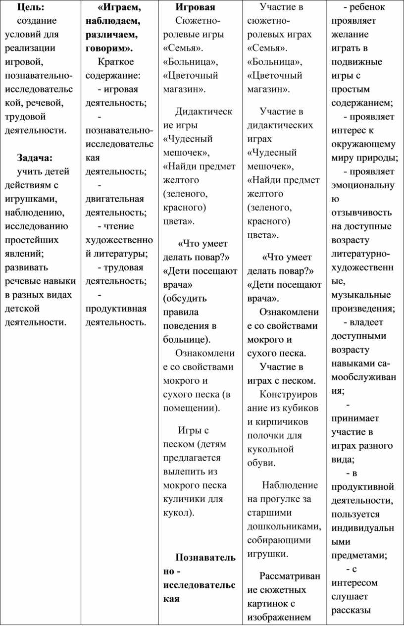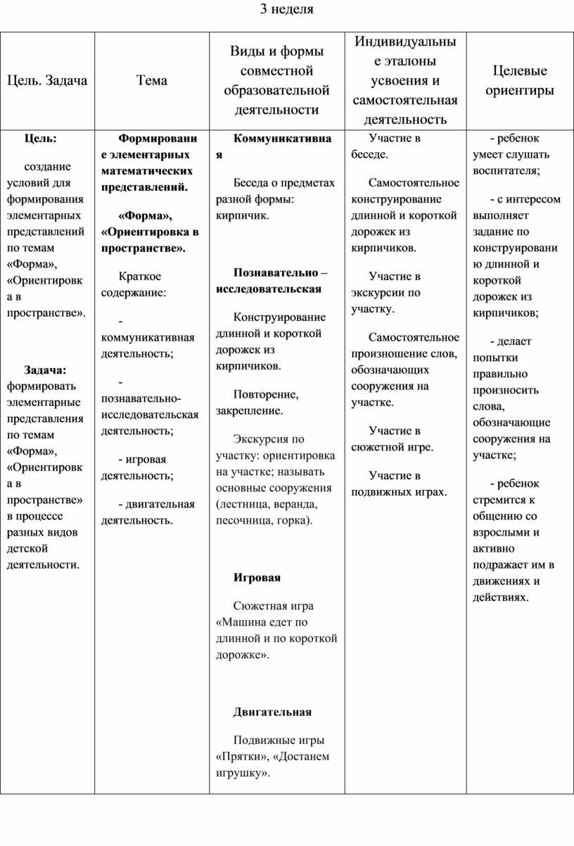 Выполнение заданий, в которых надо различить формы предметов. Участие в дидактических играх. Участие в трудовой деятельности. Наблюдение за трудом взрослых. Участие в хороводной игре.