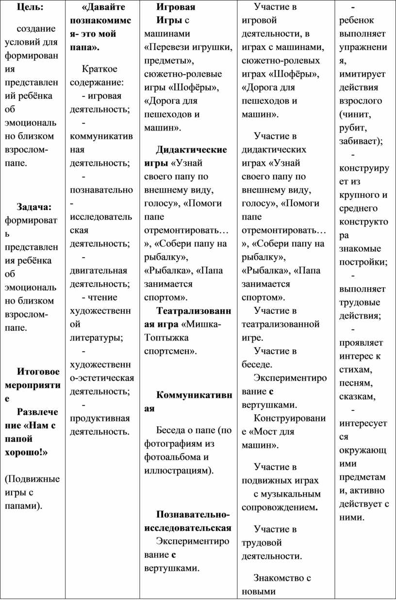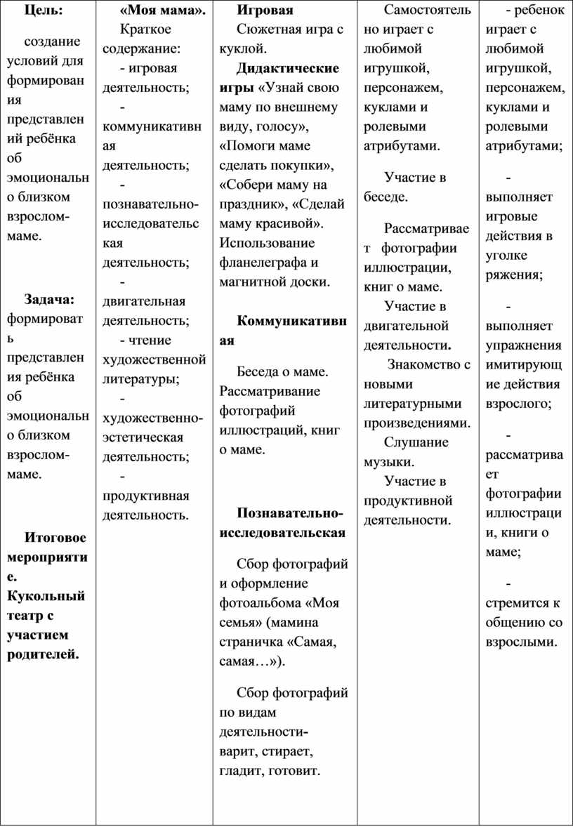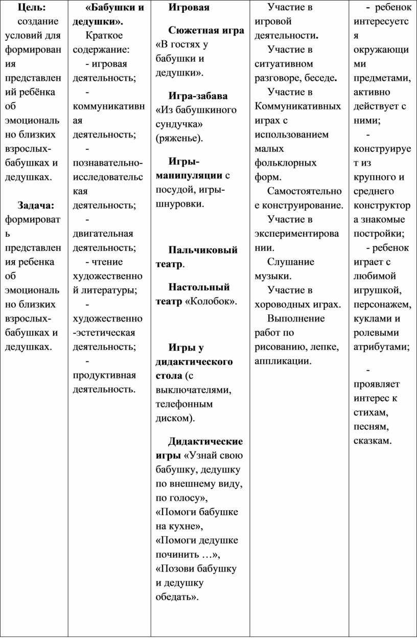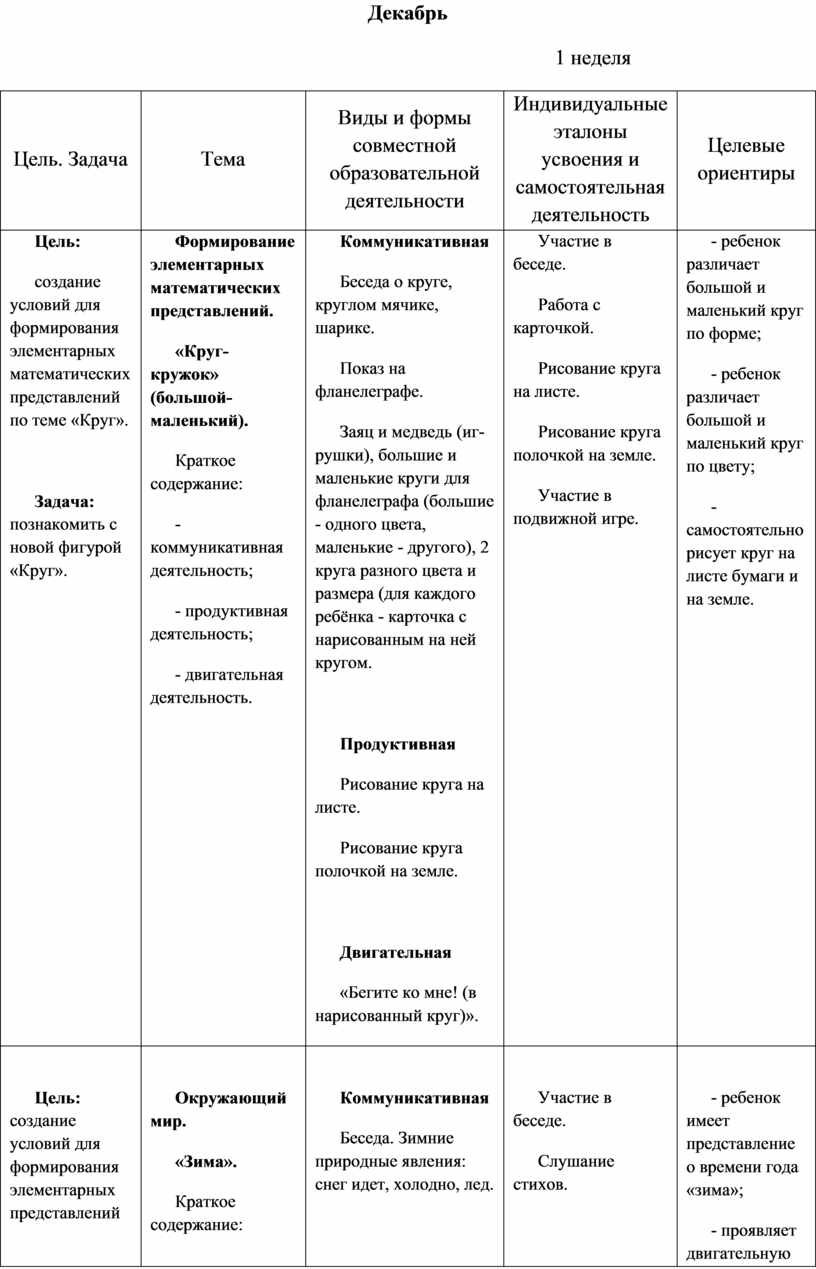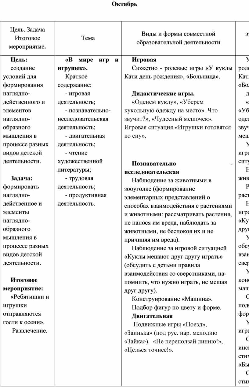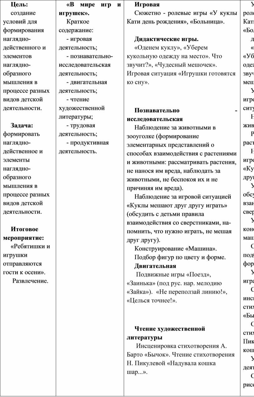Выполнение заданий, в которых надо различить формы предметов. Участие в дидактических играх. Участие в трудовой деятельности. Наблюдение за трудом взрослых. Участие в хороводной игре.