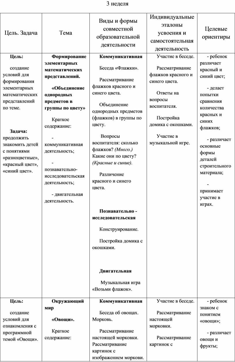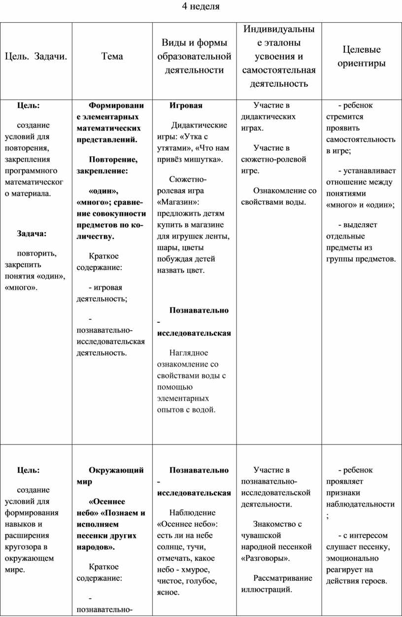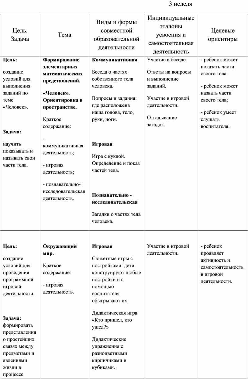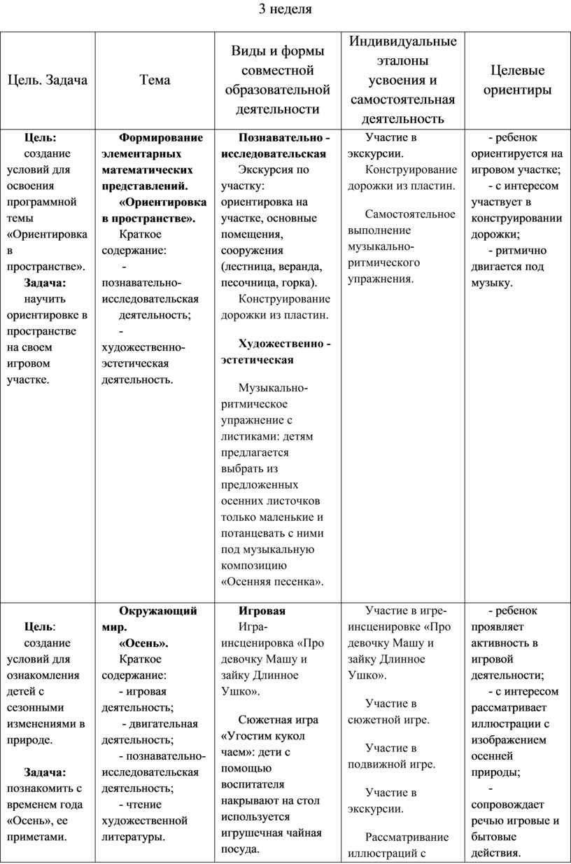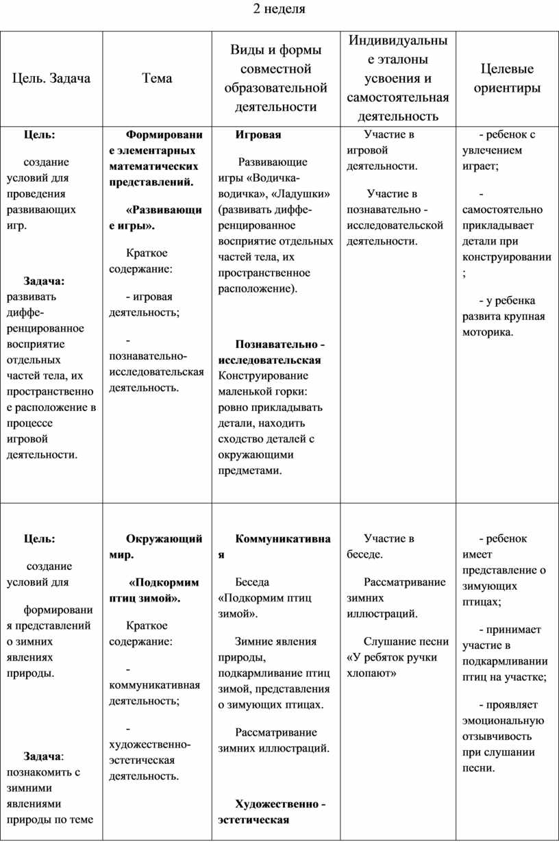 Содержательный раздел представлен в табличном варианте, в виде годового еженедельного планирования образовательной деятельности по пяти образовательным областям, которые соответствуют стандарту. Формат изложения материала этого раздела представляет вариант нового поколения планирования рабочих программ.