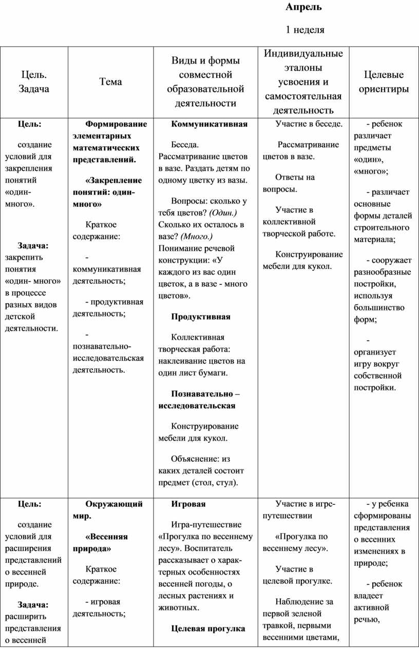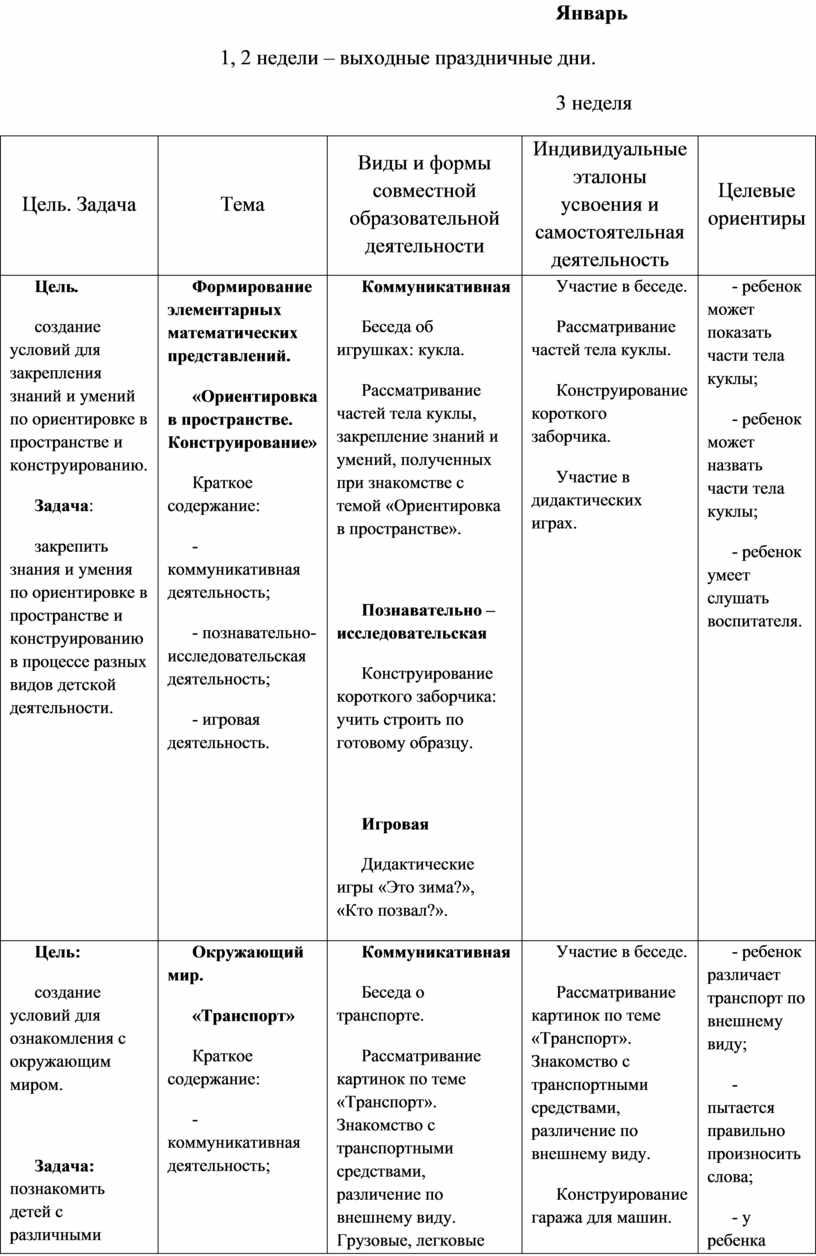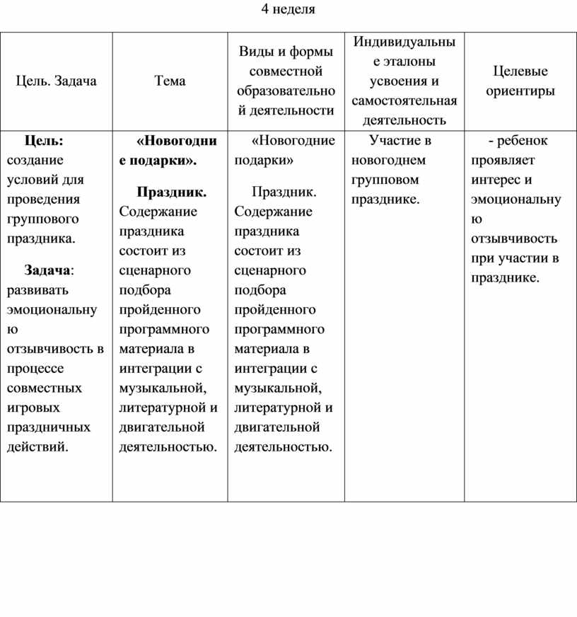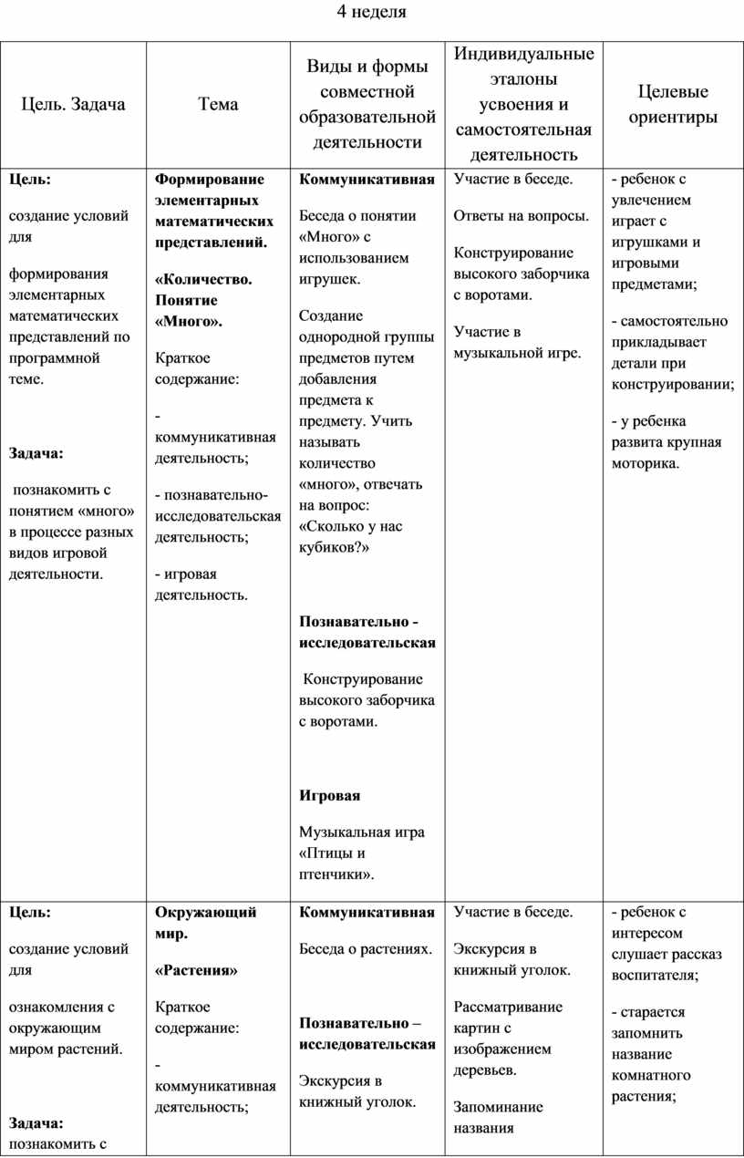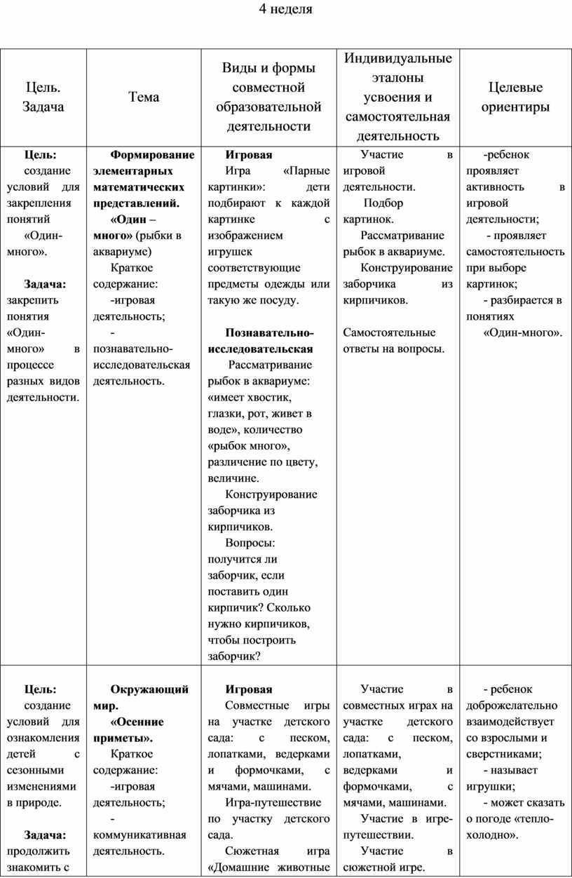 Содержательный раздел представлен в табличном варианте, в виде годового еженедельного планирования образовательной деятельности по пяти образовательным областям, которые соответствуют стандарту. Формат изложения материала этого раздела представляет вариант нового поколения планирования рабочих программ.