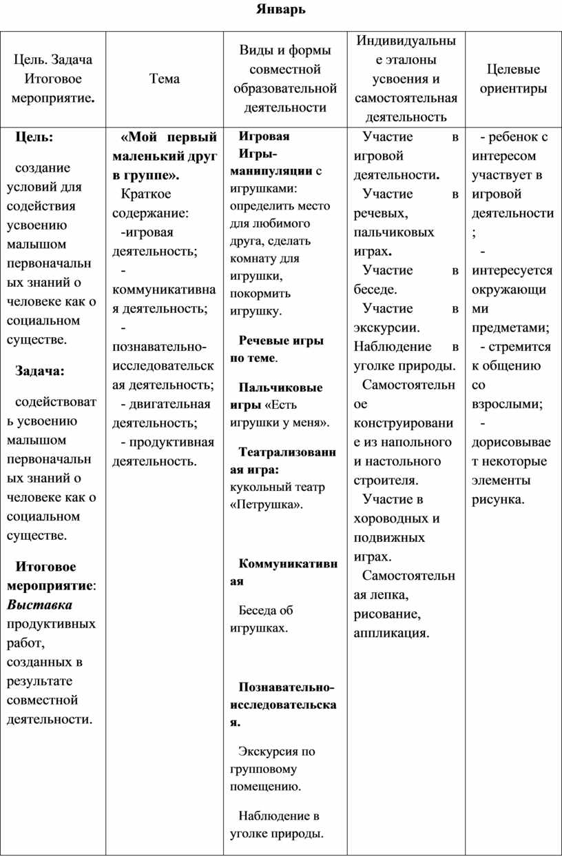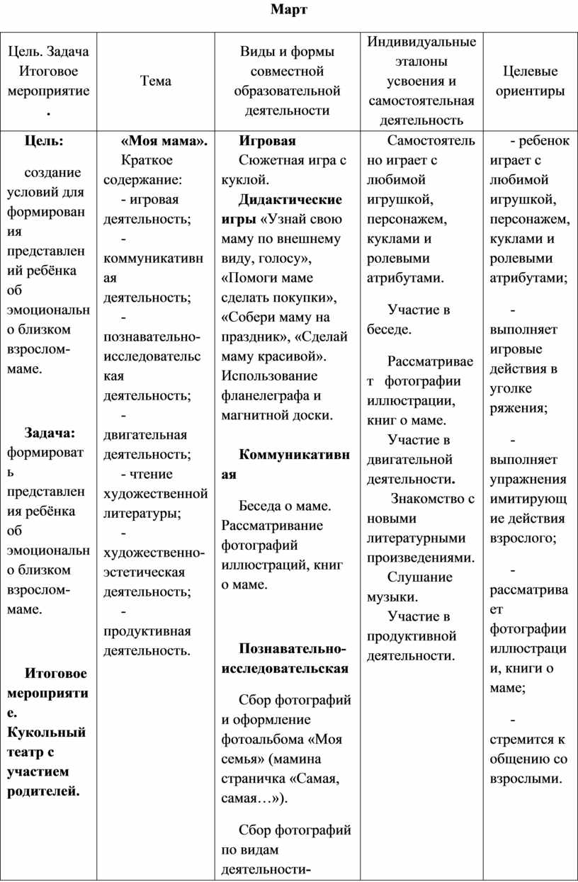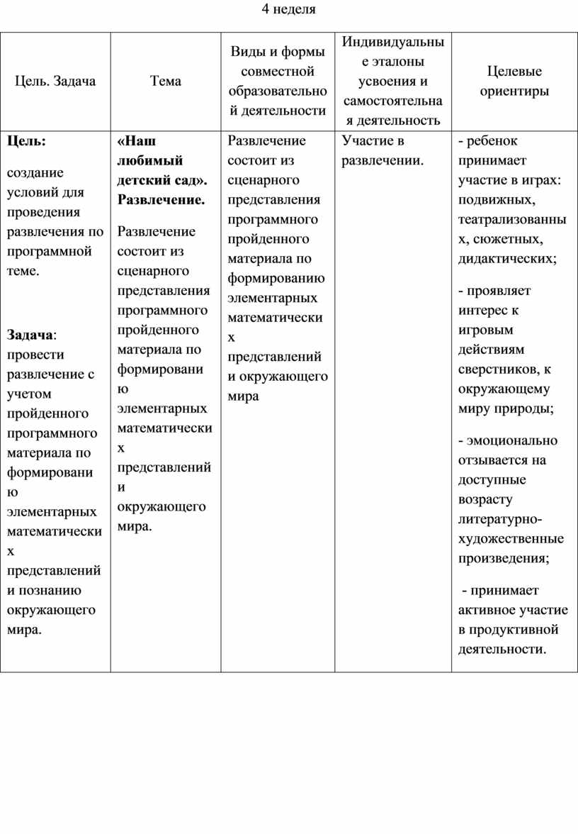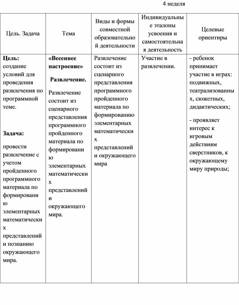 Цель. Задача Итоговое мероприятие. |