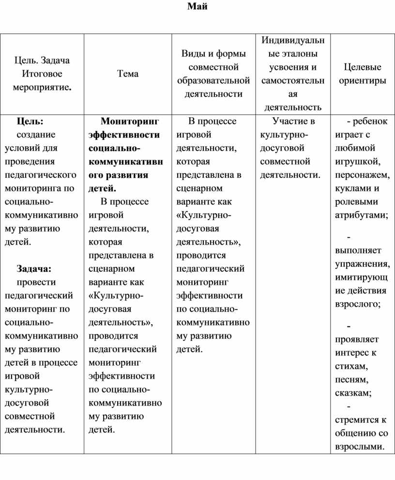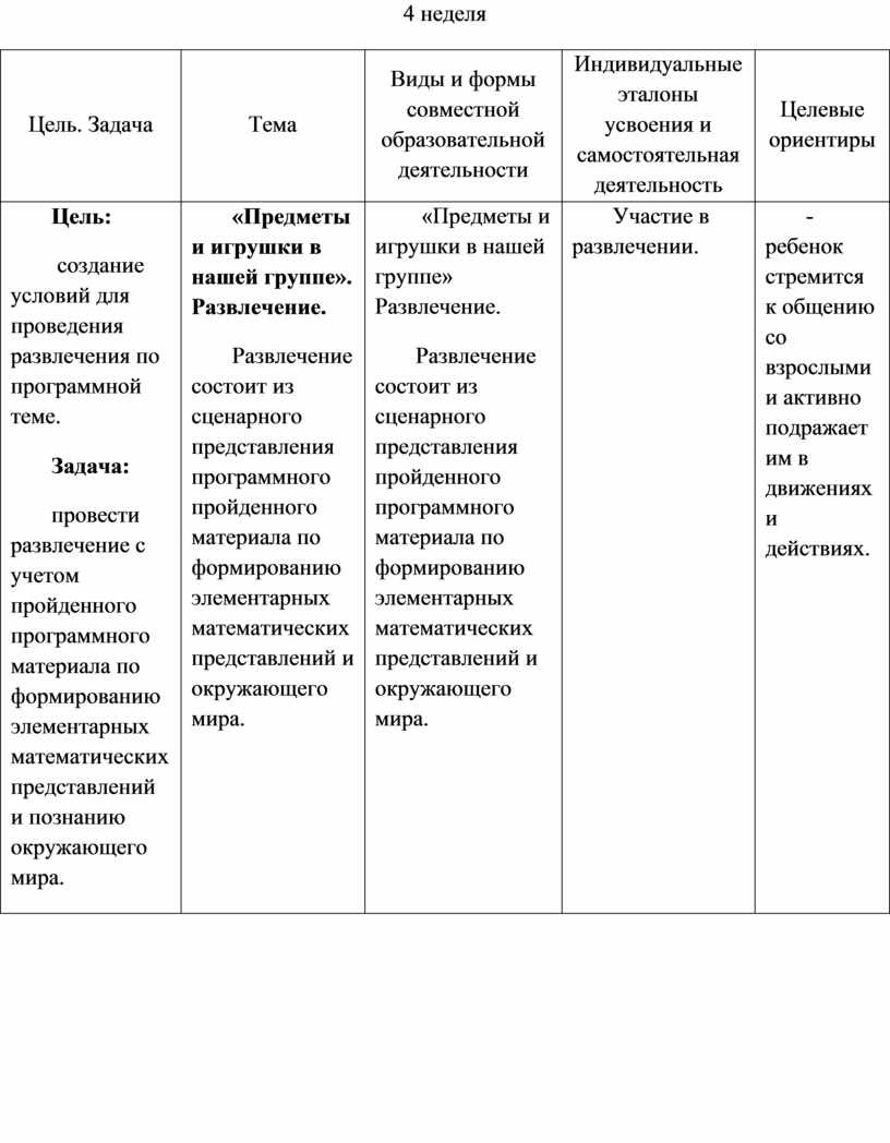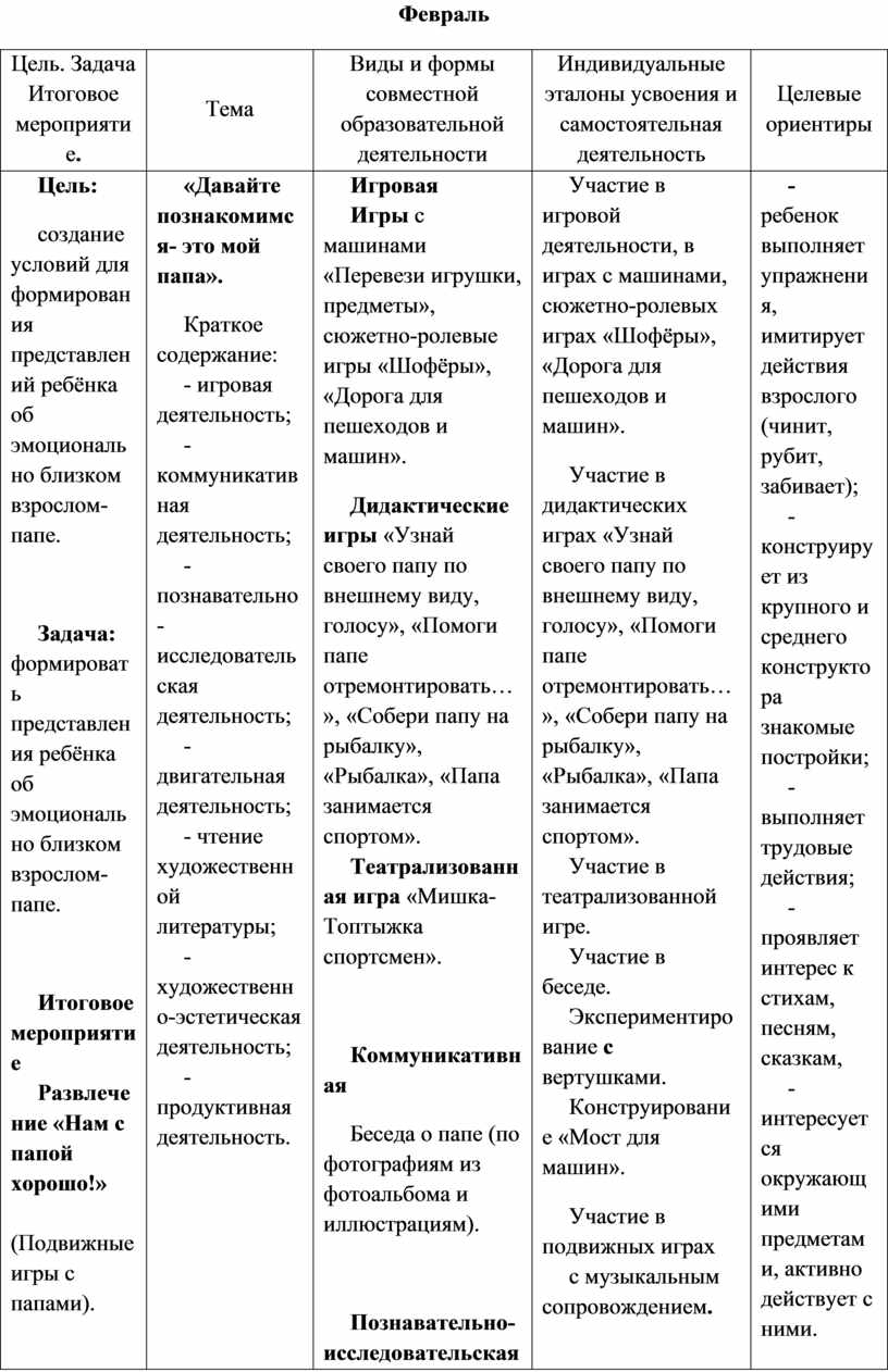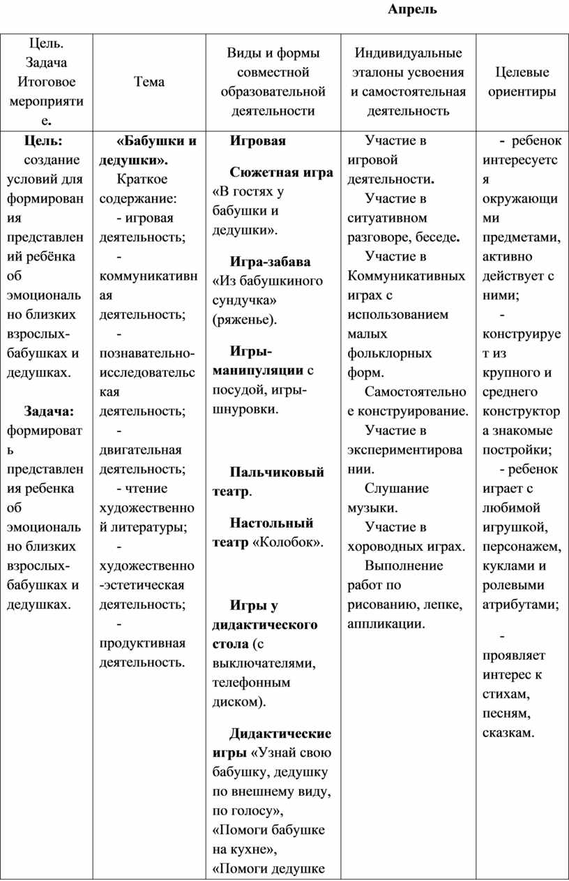 Цель. Задача Итоговое мероприятие. |