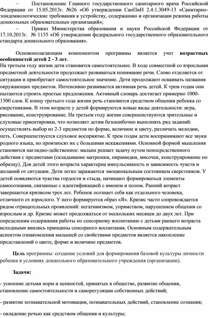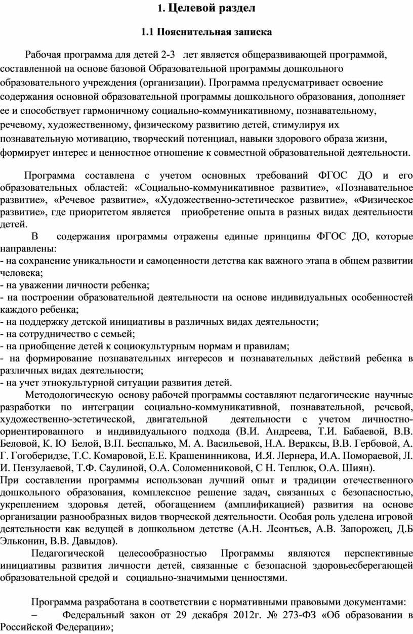 Рабочая программа для детей 2-3 лет является общеразвивающей программой, составленной на основе базовой Образовательной программы дошкольного образовательного учреждения (организации). Программа предусматривает освоение содержания основной образовательной программы дошкольного образования, дополняет ее и способствует гармоничному социально-коммуникативному, познавательному, речевому, художественному, физическому развитию детей, стимулируя их познавательную мотивацию, творческий потенциал, навыки здорового образа жизни, формирует интерес и ценностное отношение к совместной образовательной деятельности.