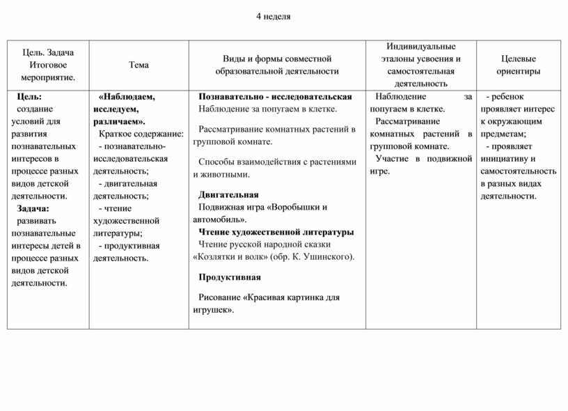 Познавательно - исследовательская Наблюдение за попугаем в клетке. Рассматривание комнатных растений в групповой комнате. Способы взаимодействия с растениями и животными. Двигательная Подвижная игра «Воробышки и автомобиль». Чтение художественной литературы Чтение русской народной сказки «Козлятки и волк» (обр. К. Ушинского). Продуктивная Рисование «Красивая картинка для игрушек».
